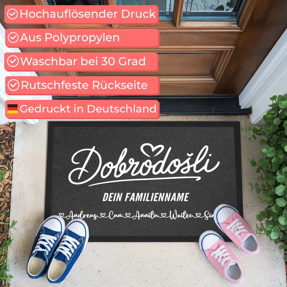 Entdecke die perfekte Möglichkeit, dein Zuhause herzlich zu begrüßen mit unserer individuellen Fußmatte mit Namen Familie Willkommen Kroatisch. Diese personalisierte Fußmatte ist nicht nur ein funktionales Accessoire, sondern auch ein stilvolles Statement für jeden Eingangsbereich. Egal ob du einen eigenen Spruch, Wunschtext oder den Familiennamen hinzufügen möchtest – deine Fußmatte wird einzigartig und schafft eine persönliche Note. Mit dem schönen Spruch 'Willkommen Auf Kroatisch Dobrodošli' heißt du deine Gäste auf besondere Weise willkommen.