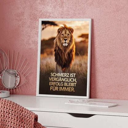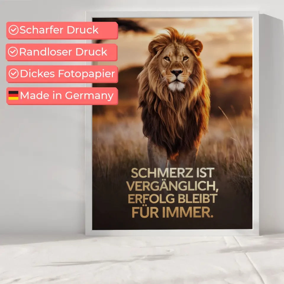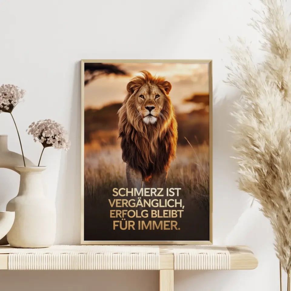 Entdecken Sie unser inspirierendes Poster Löwe mit Zitat in goldenem Licht im Hintergrund, das nicht nur Ihre Wände verschönert, sondern auch eine kraftvolle Botschaft vermittelt. Dieses beeindruckende Wandbild zeigt einen majestätischen Löwen, der aufrecht steht und dessen goldene Mähne majestätisch im Wind weht. Die ruhige Savanne mit hohem Gras und die untergehende Sonne schaffen eine warme, einladende Atmosphäre, die jeden Raum zum Leben erweckt. Das überlagerten Zitat 'Schmerz ist vergänglich, Erfolg bleibt für immer“ macht dieses Poster nicht nur zu einem visuellen Highlight, sondern auch zu einer Quelle der Motivation und Inspiration.