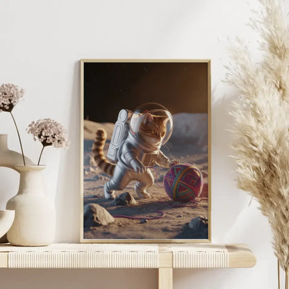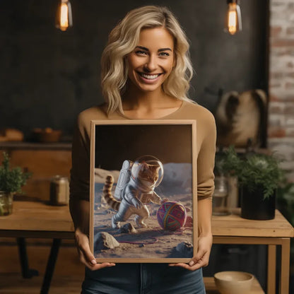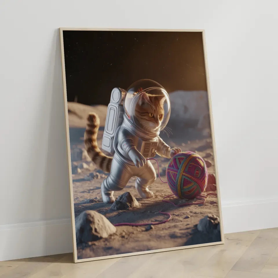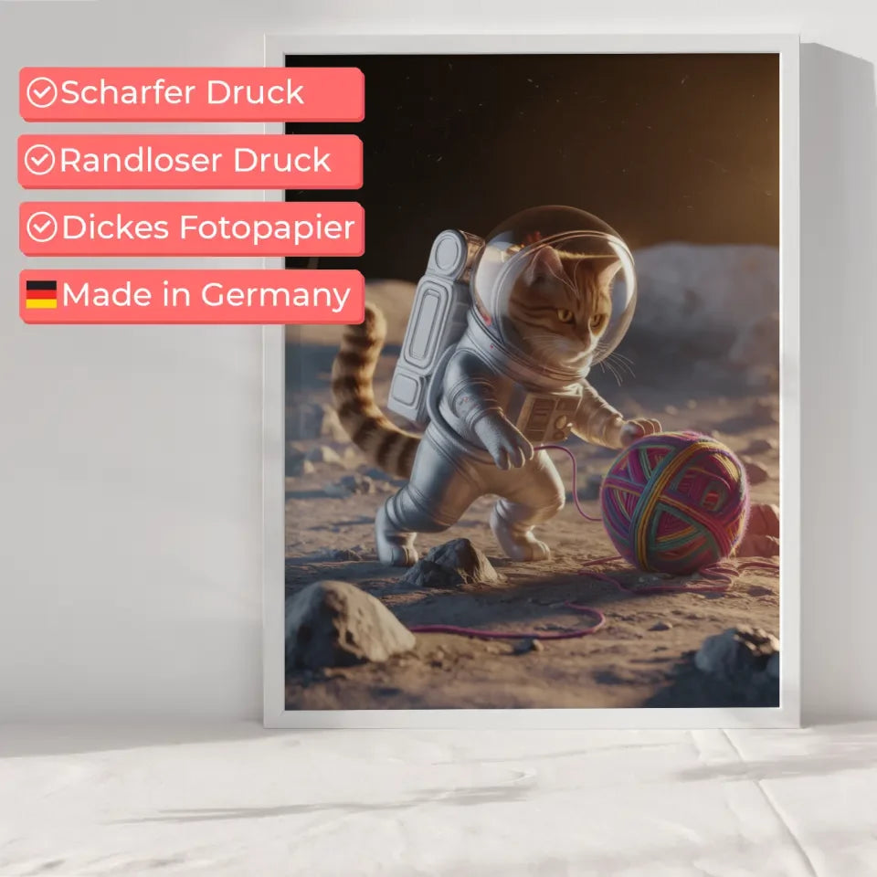 Entdecken Sie unser einzigartiges Katzen Astronaut Poster im filmischen Design, das sowohl Katzenliebhaber als auch Fans außergewöhnlicher Kunst begeistert. Dieses exklusive Poster zeigt eine katzenartige Astronautenfigur in einem futuristischen Raumanzug, die spielerisch auf der staubigen Oberfläche des Mondes agiert. Die Katze scharrt neugierig nach einem leuchtend bunten Garnknäuel, welches einen faszinierenden Kontrast zur kargen Mondlandschaft bietet. Diese eindrucksvolle Szenerie ist in warmes, goldenes Licht getaucht, was dem gesamten Bild eine traumhafte und cineastische Atmosphäre verleiht.
