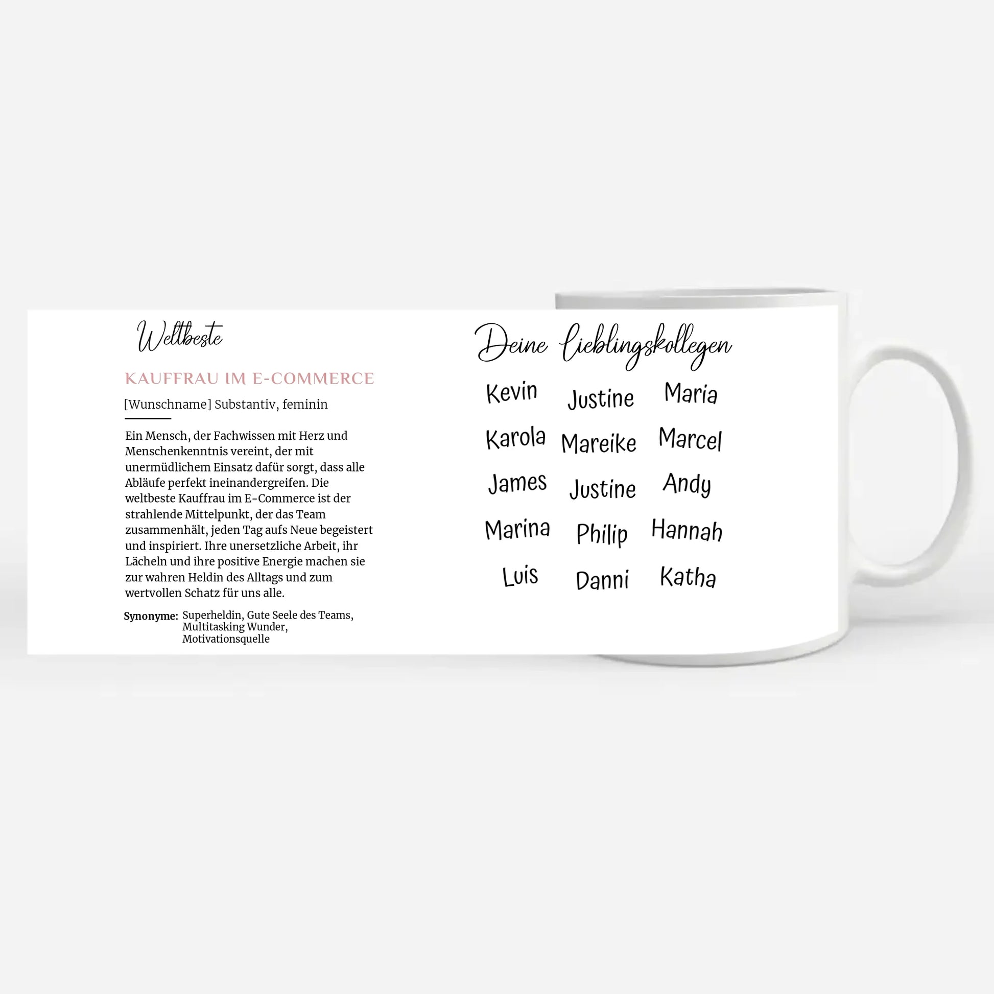 Diese personalisierte Tasse ist perfekt für alle Kauffrauen im E-Commerce . Also perfekt als Jubiläumsgeschenk oder zum Abschied .
