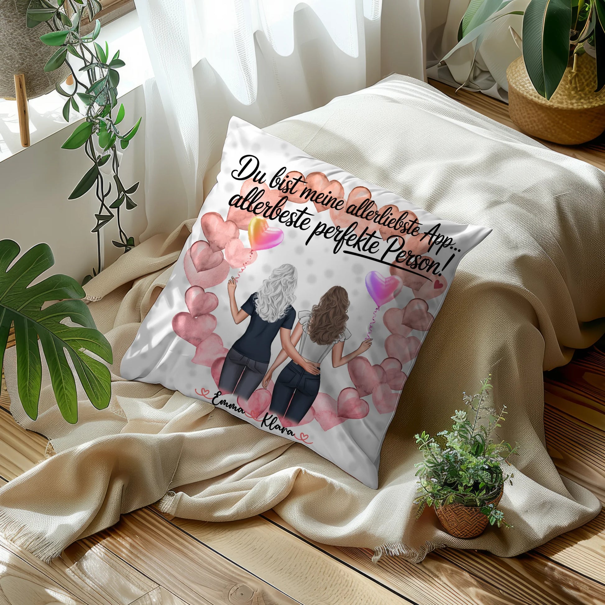 Überrasche deine beste Freundin mit einem persönlichen Kissen, das Emotionen weckt und lange in Erinnerung bleibt. Dieses personalisierbare Kissen ist das ideale Geburtstagsgeschenk und kombiniert 2 individuelle Clipart-Frauen mit Namen, Foto und deinem Wunschtext für eine liebevolle Botschaft.