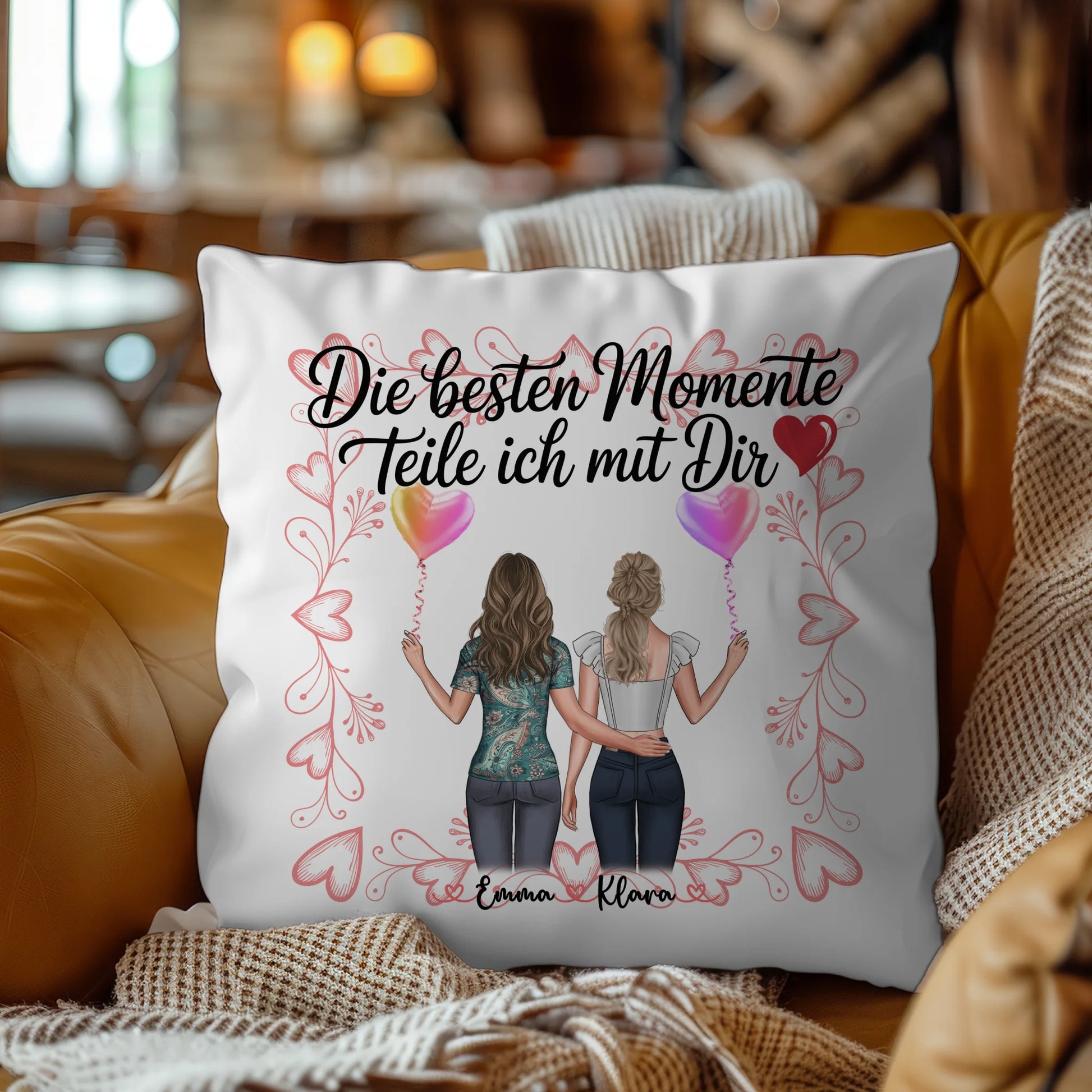 Dieses personalisierte Kissen ist das ideale Geschenk für deine Schwester zum Geburtstag und verbindet emotionale Botschaft und individuelles Design. Auf dem Motiv steht Die besten Momente teile ich mit dir. Du kannst das Kissen mit 2 Clipart Frauen, den Namen deiner Schwester sowie Hintergrundbild und eigenem Spruch oder Wunschtext personalisieren, damit es genau zu euch passt.