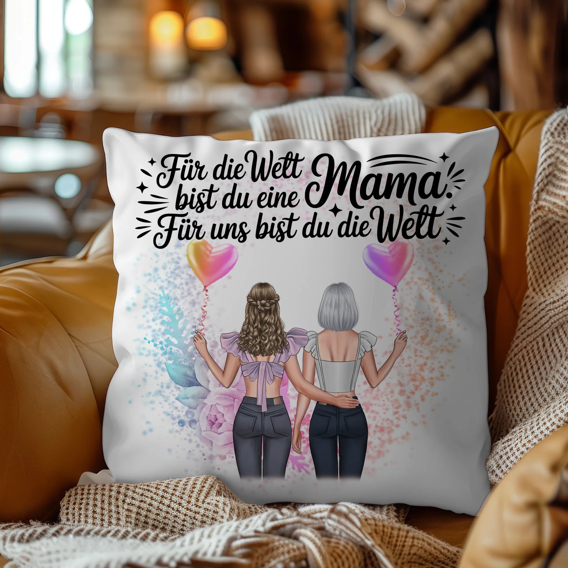 Kissen Für Mama personalisiert mit 2 Clipart Frauen, Namen, Hintergrundbild & Spruch