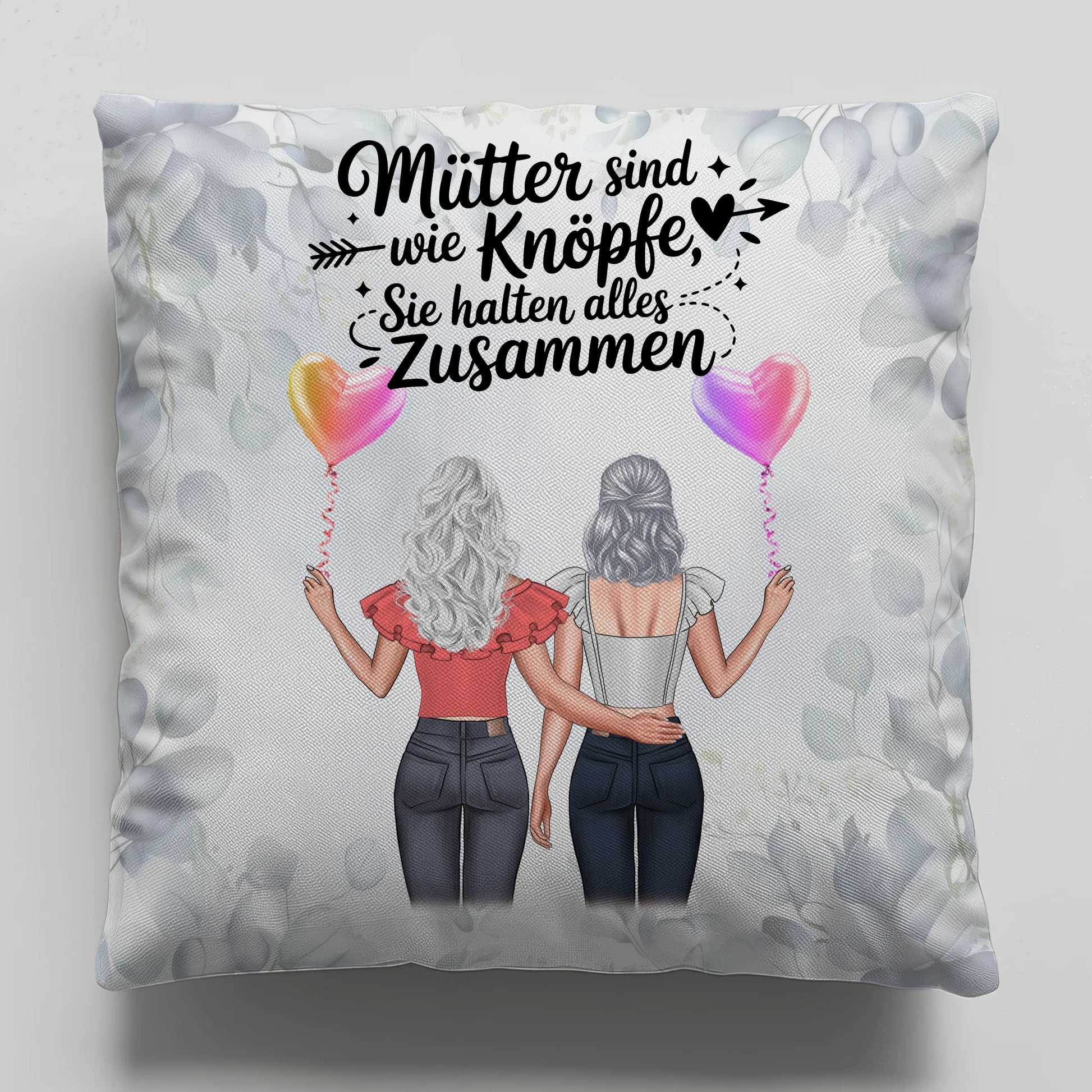Überrasche Mama zum Muttertag mit einem personalisierten Kissen, das Gefühl und Stil vereint. Dieses Kissen Für Mama ist komplett individualisierbar mit 2 Clipart Frauen, Namen, Hintergrundbild und deinem Wunschtext und eignet sich perfekt als liebevolle Erinnerung. Auf dem Design steht: Mütter sind wie Knöpfe, sie halten alles zusammen.