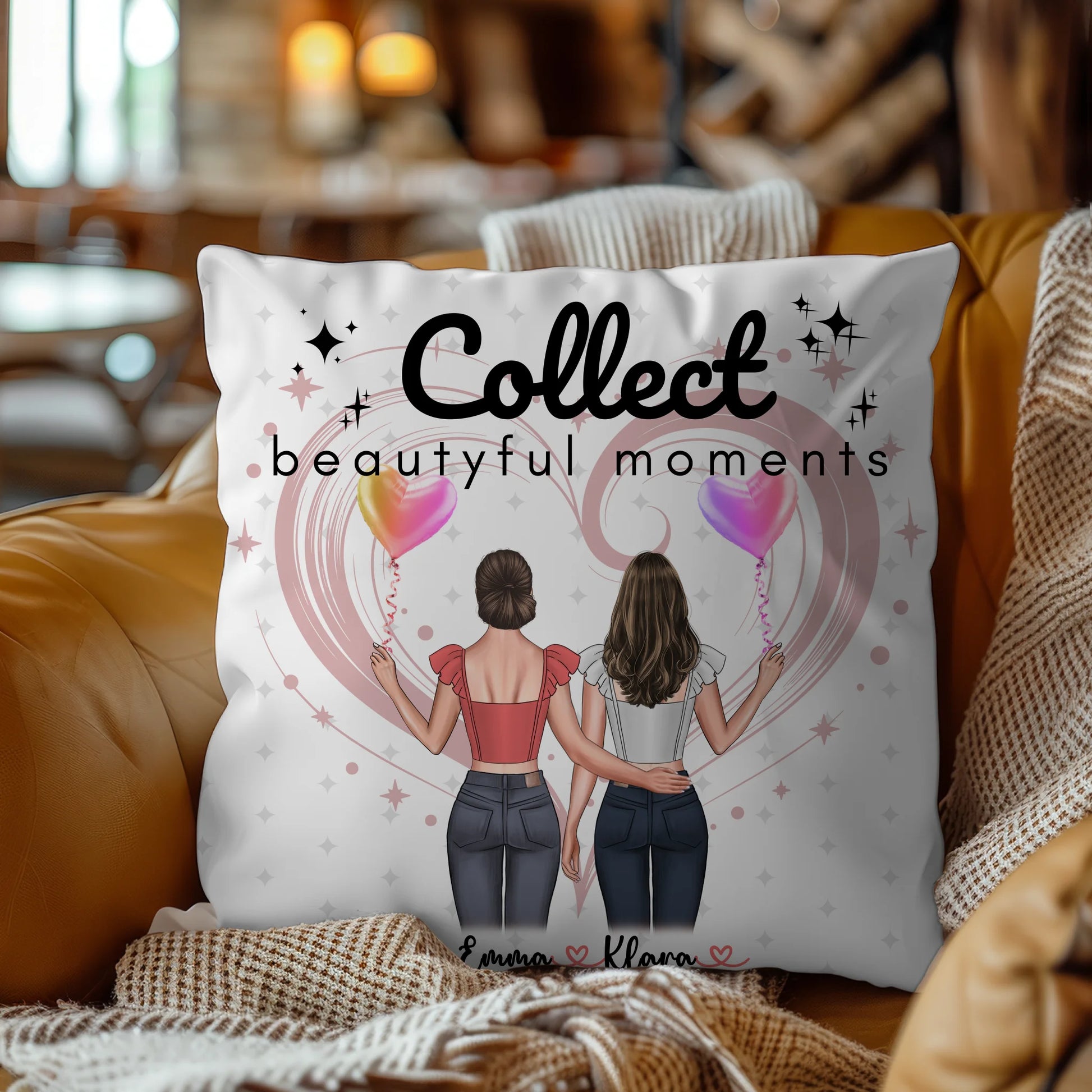 Du kannst das Motiv ganz nach Wunsch anpassen: 2 Clipart Frauen, Namen, Hintergrundbild & eigener Spruch oder Wunschtext. Auf dem Design steht der liebe Spruch Collect Beautyful Moments, den du beibehalten oder durch einen eigenen Text ersetzen kannst.