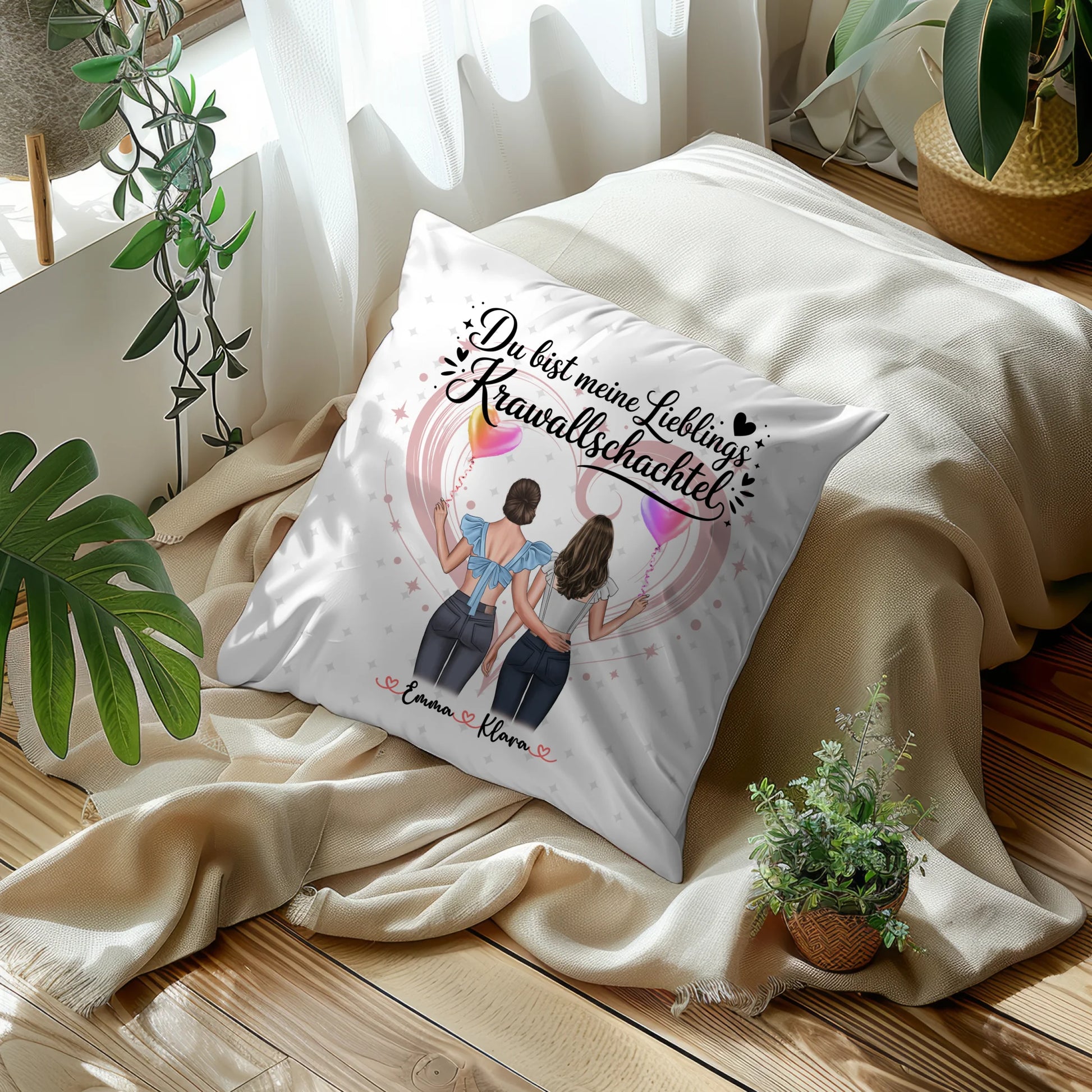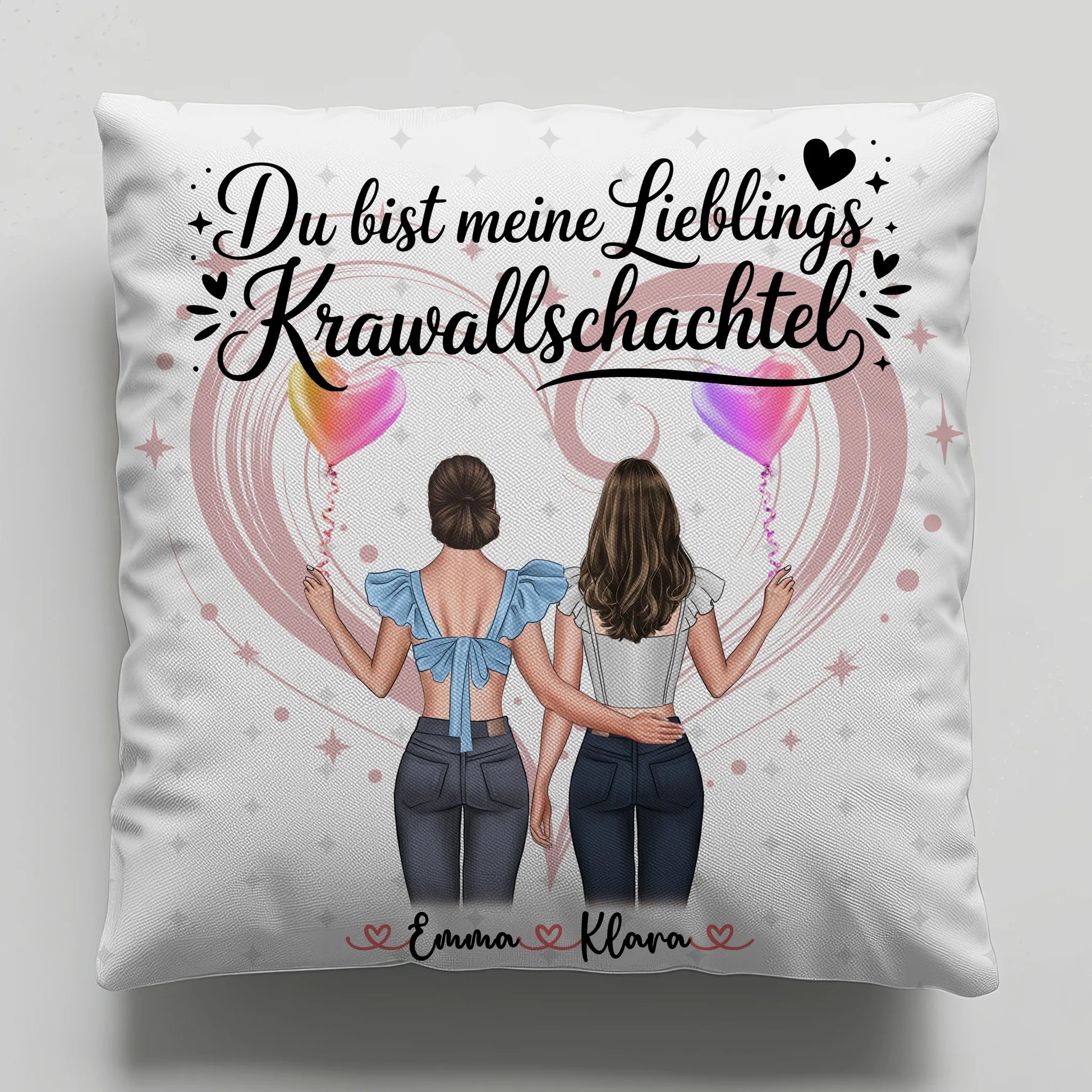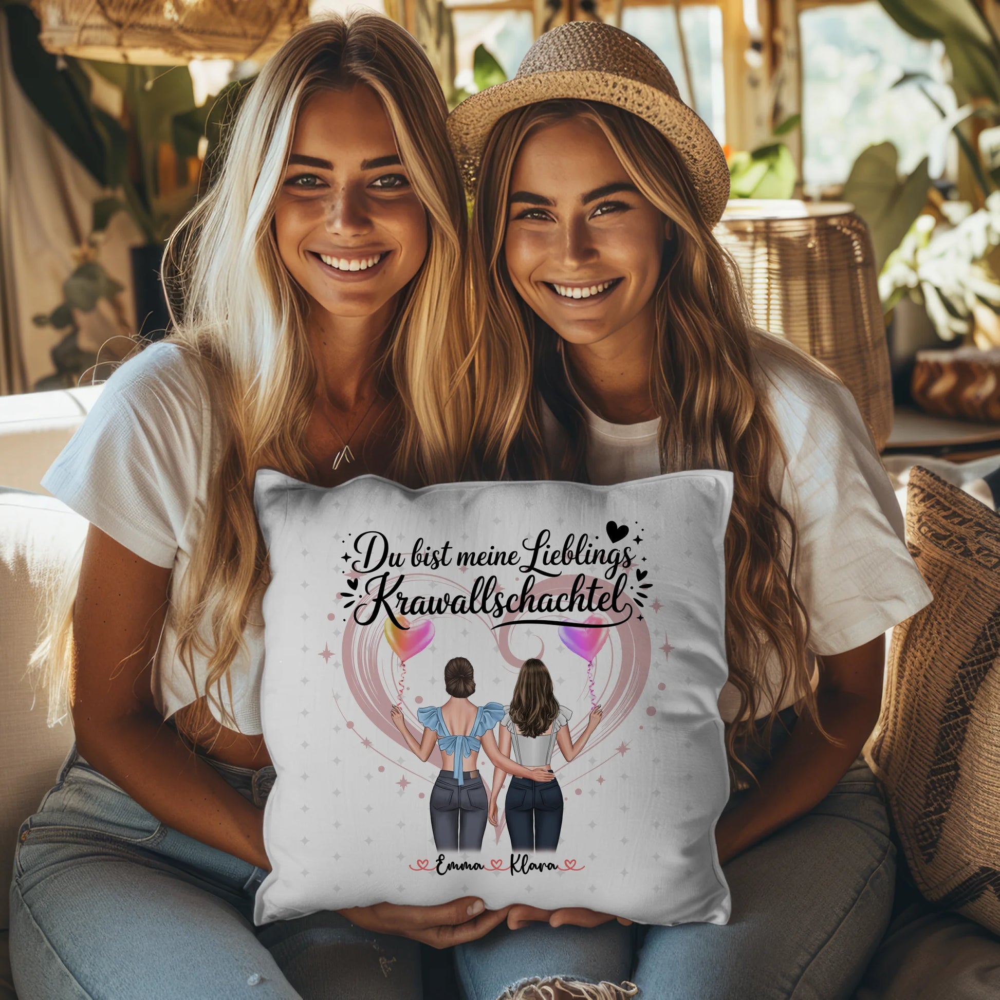 Überrasche deine Schwester zum Geburtstag mit einem personalisierten Kissen, das Persönlichkeit zeigt und direkt ins Herz trifft. Auf dem Design steht der liebevolle Spruch Du bist meine Lieblings Krawallschachtel und du kannst Namen, Figuren, Hintergrund und Text ganz nach Wunsch anpassen.