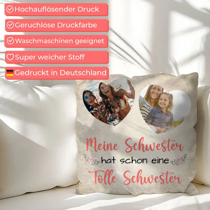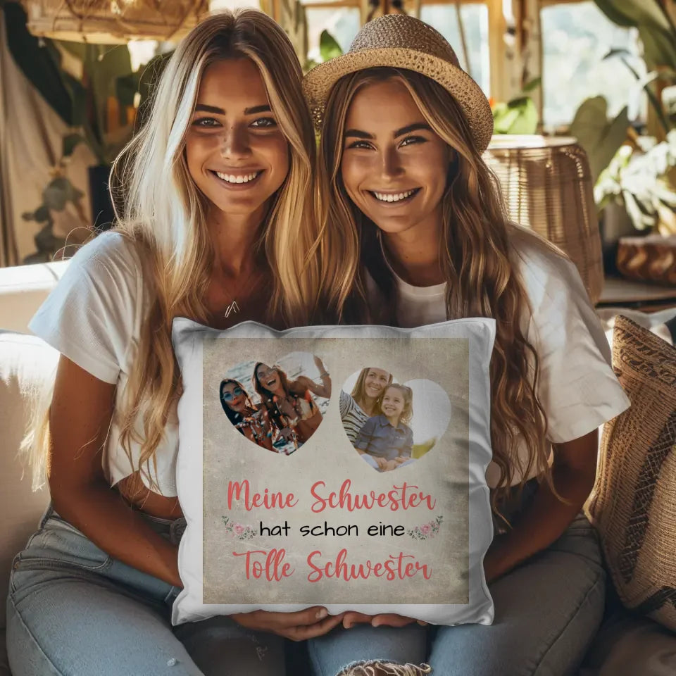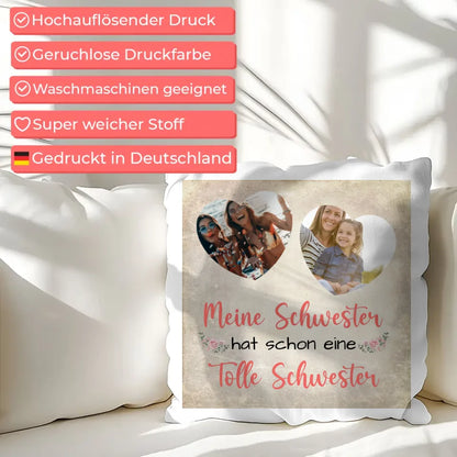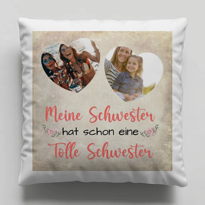 Du möchtest etwas einzigartiges verschenken? Dann ist Unser Kissen Personalisiert Schwester Zum Geburtstag mit 2 Herz Fotos ein einzigartiges personalisiertes Geschenk.