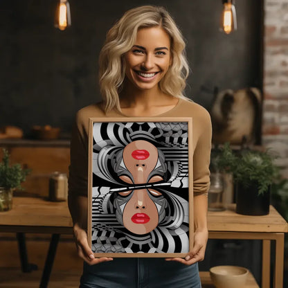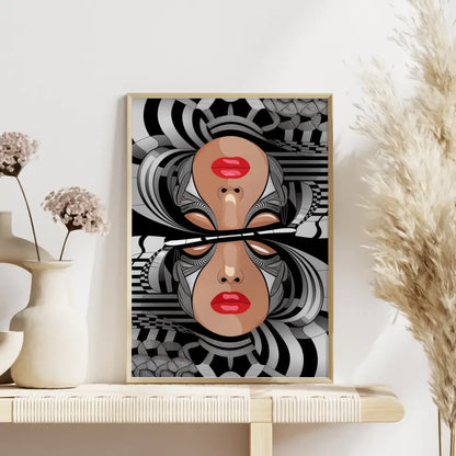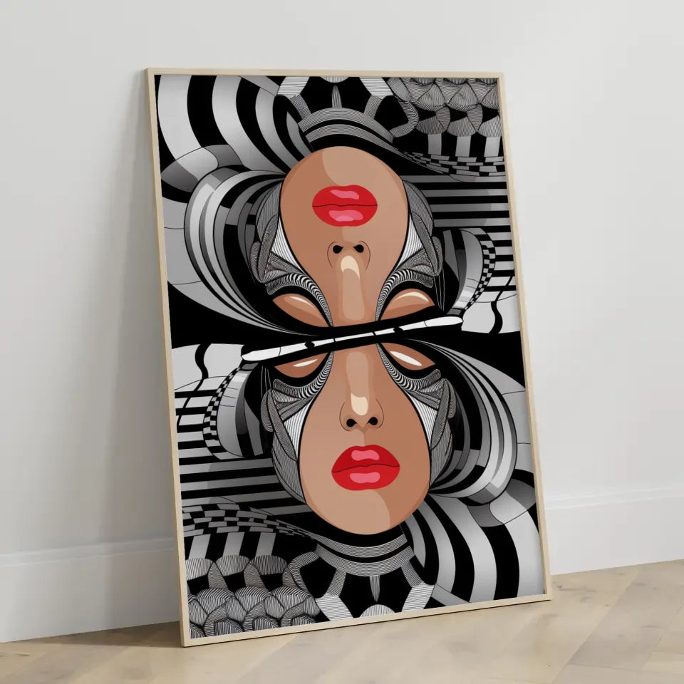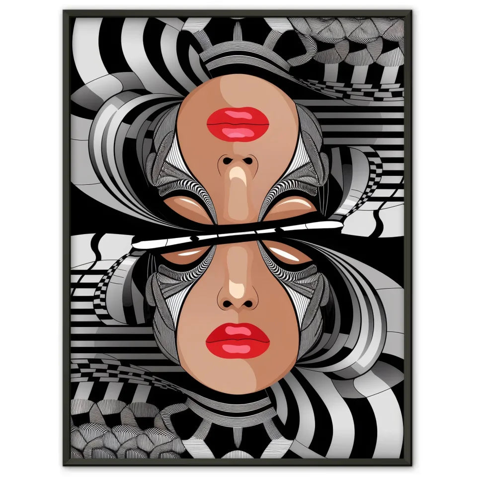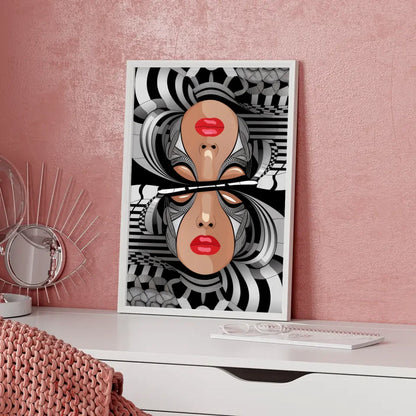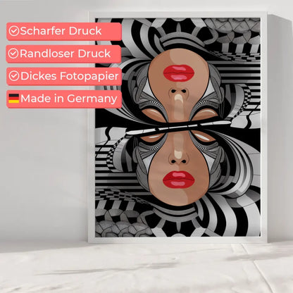 Entdecken Sie unser einzigartiges Poster, das im kreativen Pop-Art Stil gestaltet ist und beeindruckende weibliche Gesichter mit faszinierenden Mustern präsentiert. Dieses Kunstwerk, das zur Kategorie Illustration gehört, bringt frische Farbe und einen Hauch von Modernität in jeden Raum. Die 3D-Stildarstellung bietet eine Nahaufnahme von zwei übereinander angeordneten weiblichen Gesichtern, die mit aufwendigen schwarz-weißen Mustern und geometrischen Formen verziert sind. Die betonten, leuchtend roten Lippenstifte der Frauen verleihen dem Poster einen besonderen Akzent und ziehen die Aufmerksamkeit auf sich.
