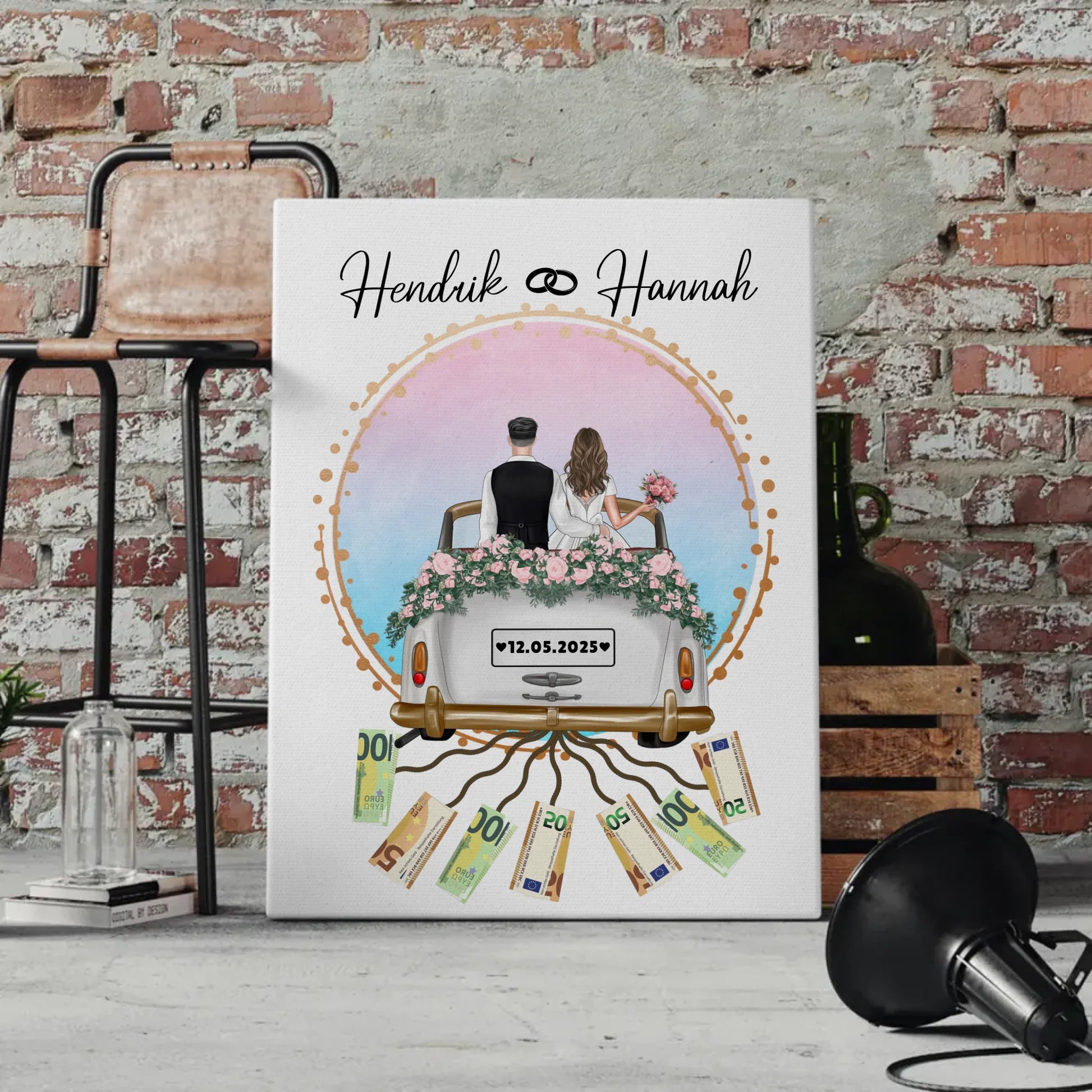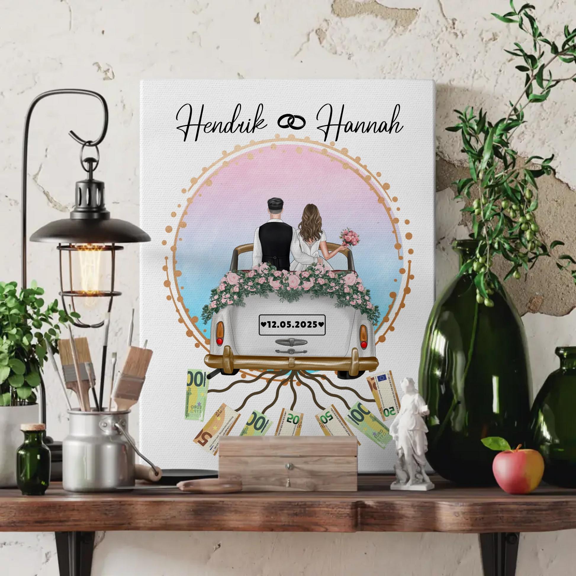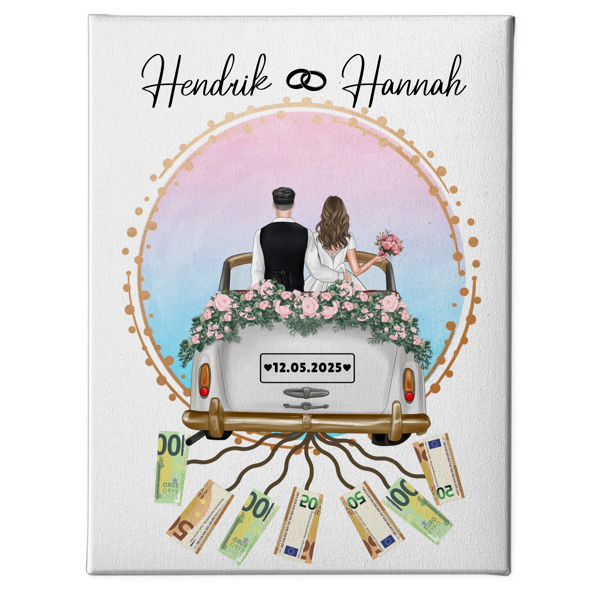 Kreatives Geldgeschenk Leinwand für Hochzeit mit Namen Datum