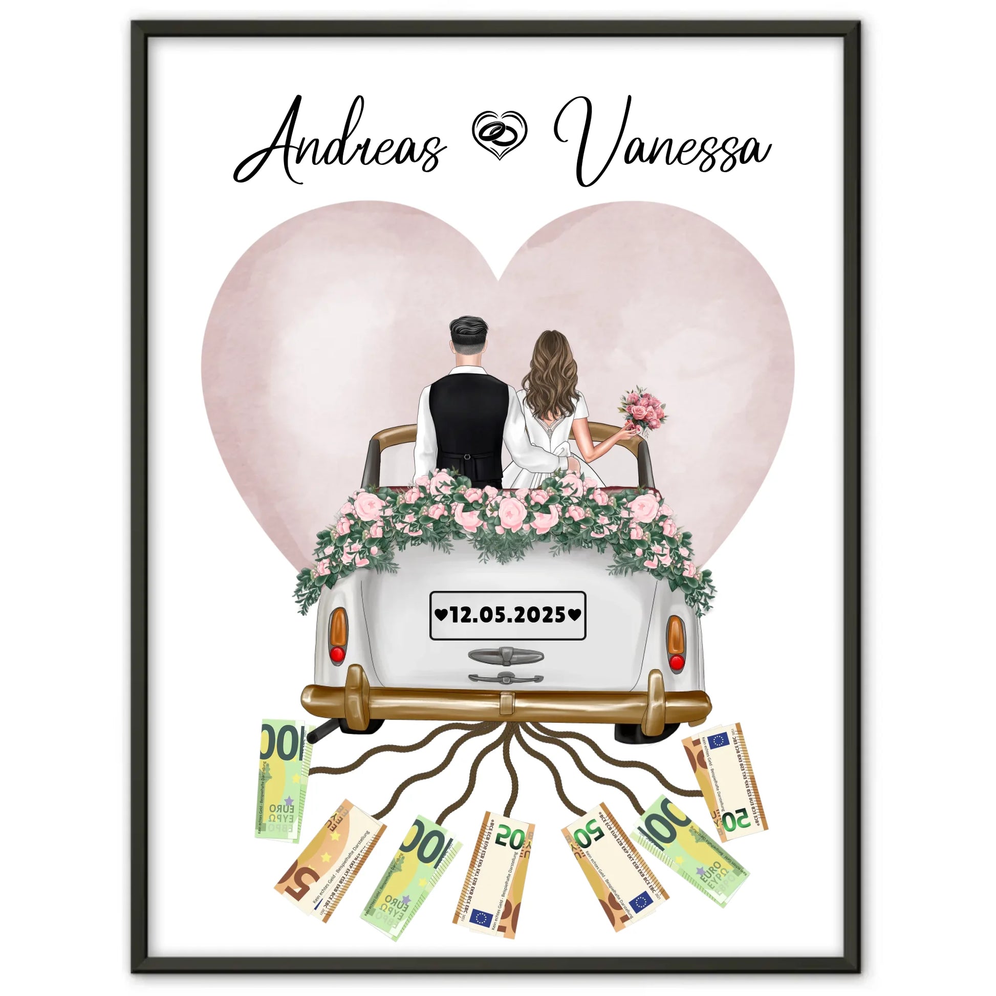 Sichere dir dieses romantische Wandbild zur Hochzeit jetzt und schaffe einen unvergesslichen Moment mit deinem persönlichen Touch – denn wer könnte sich nicht über so ein einzigartiges Geschenk freuen? Mach die Feier noch schöner und sorge dafür, dass dein Geld verschenken als Geschenkidee immer positiv in Erinnerung bleibt!
