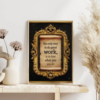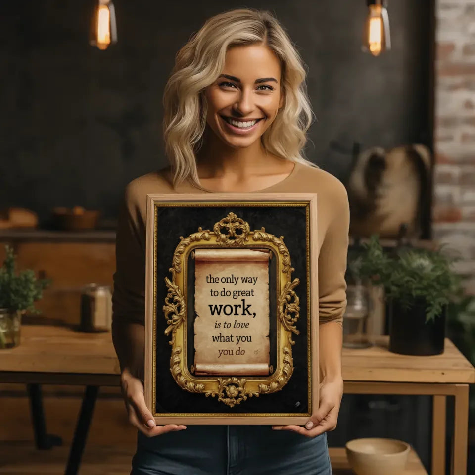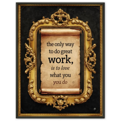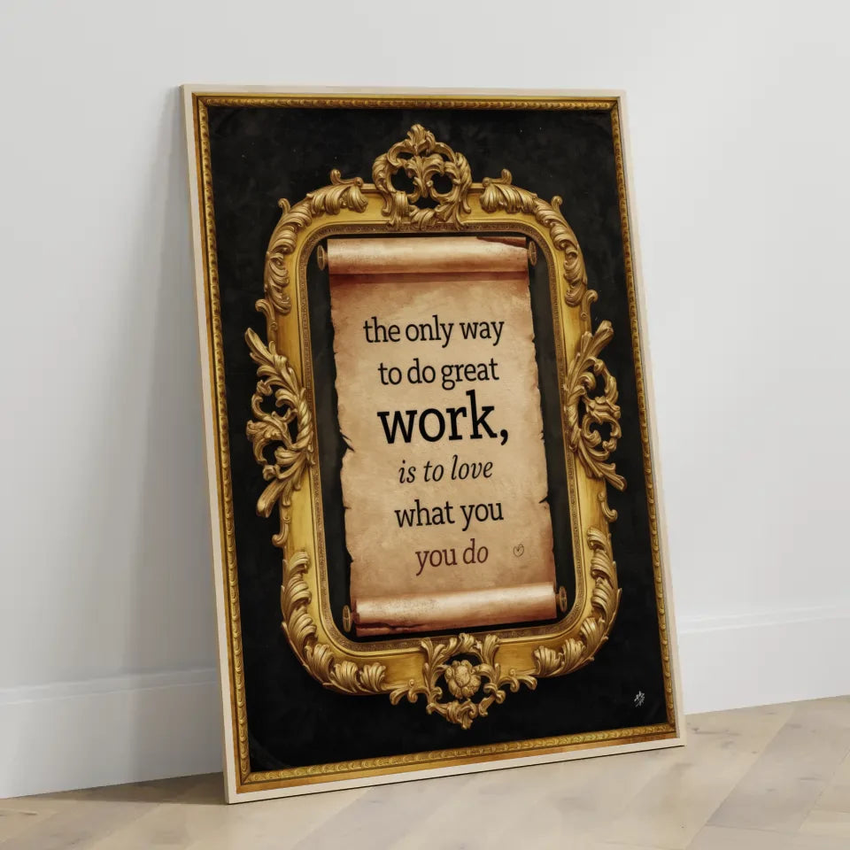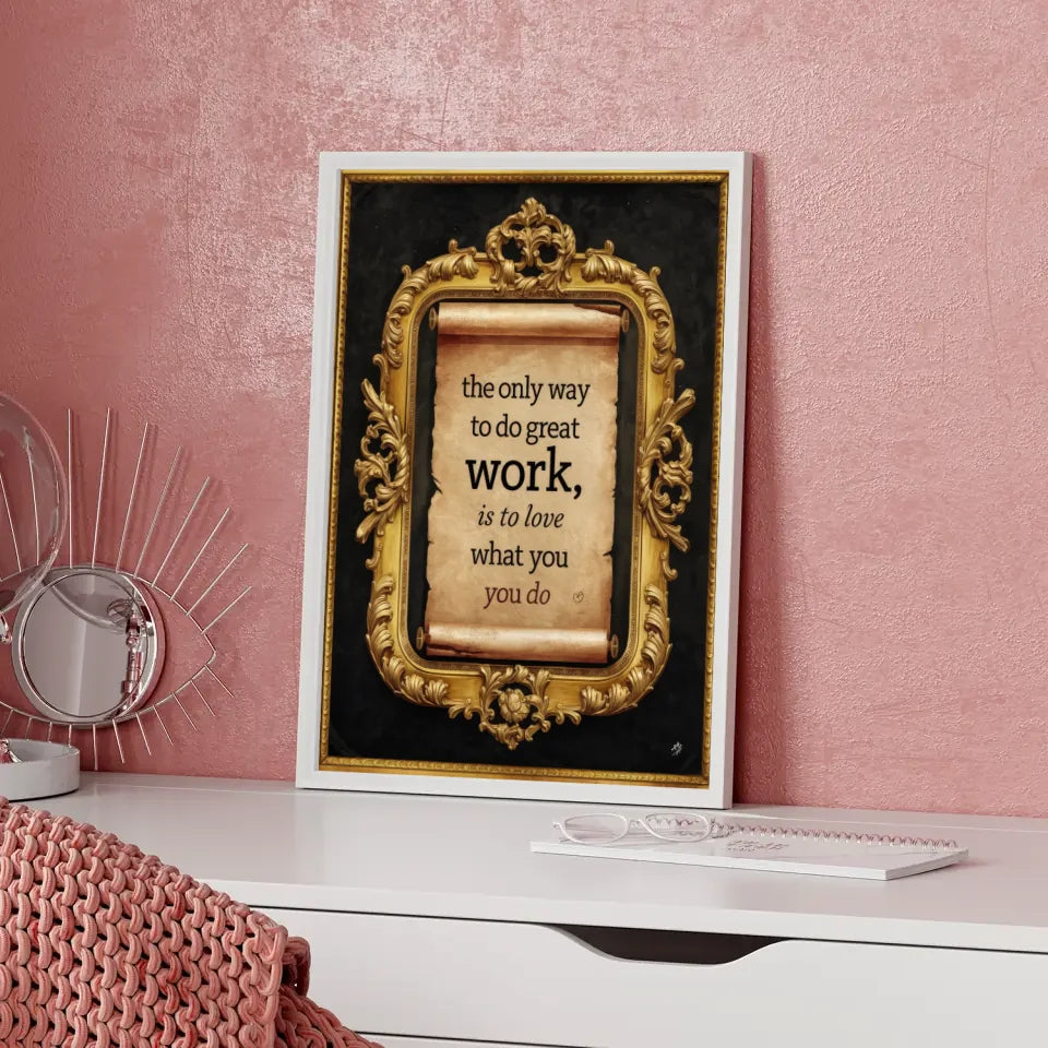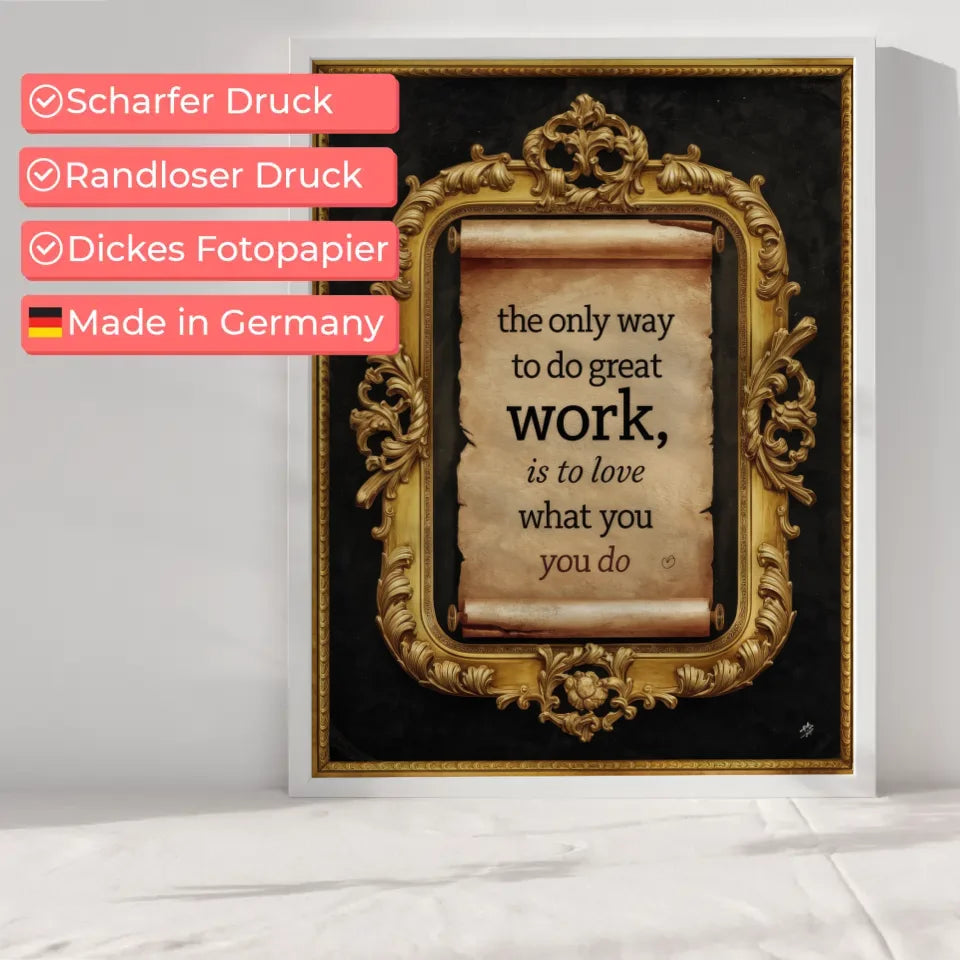 Entdecken Sie unser einzigartiges und kreatives Poster mit Zitat im goldenen Rahmen und lassen Sie sich von seiner zeitlosen Eleganz inspirieren. Dieses beeindruckende Kunstwerk, das in einem luxuriösen vergoldeten Rahmen präsentiert wird, ist nicht nur ein Blickfang für jede Wand, sondern auch eine motivierende Erinnerung an die Kraft der Leidenschaft. Das Poster enthält ein altes, verwittertes, rollenartiges Papier, auf dem ein inspirierendes Zitat prangt: Der einzige Weg, großartige Arbeit zu leisten, besteht darin, zu lieben, was man tut.“
