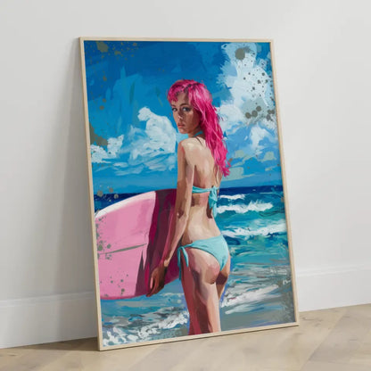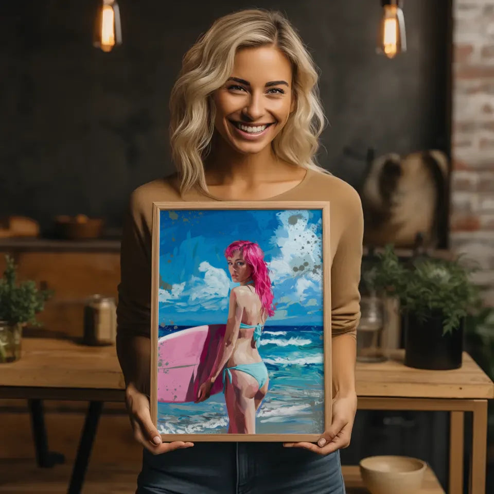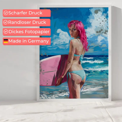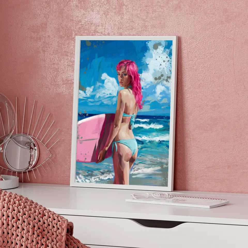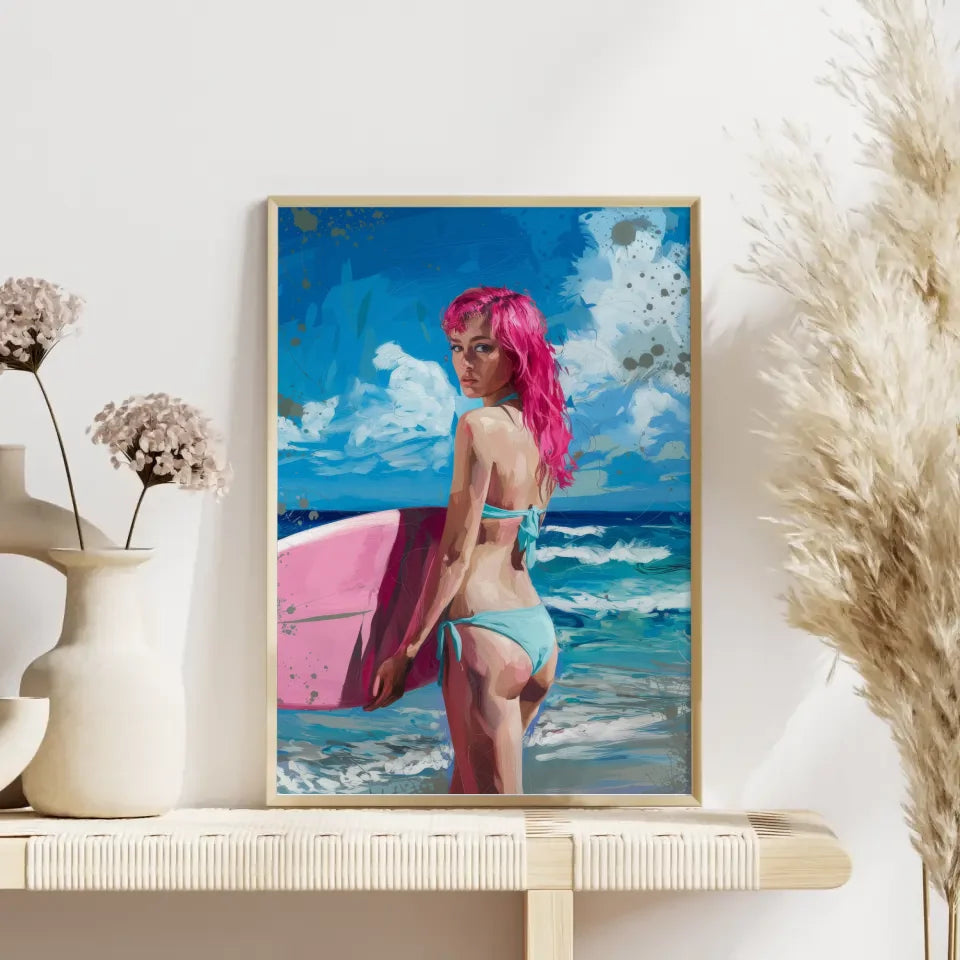 Künstlerisches Poster einer Frau am Strand mit rosa Haaren und Surfbrett
