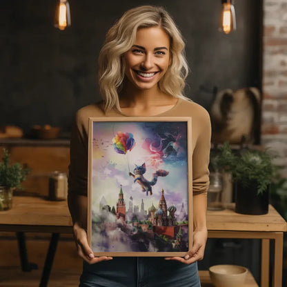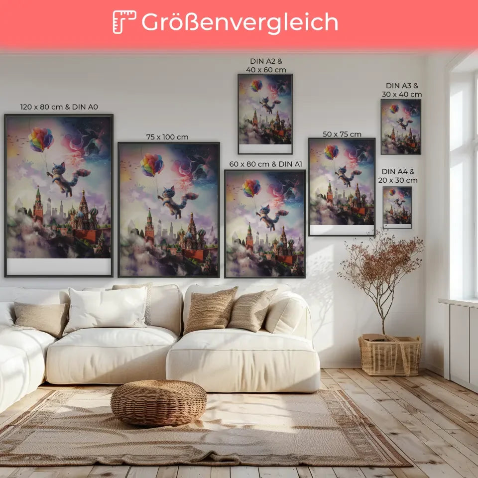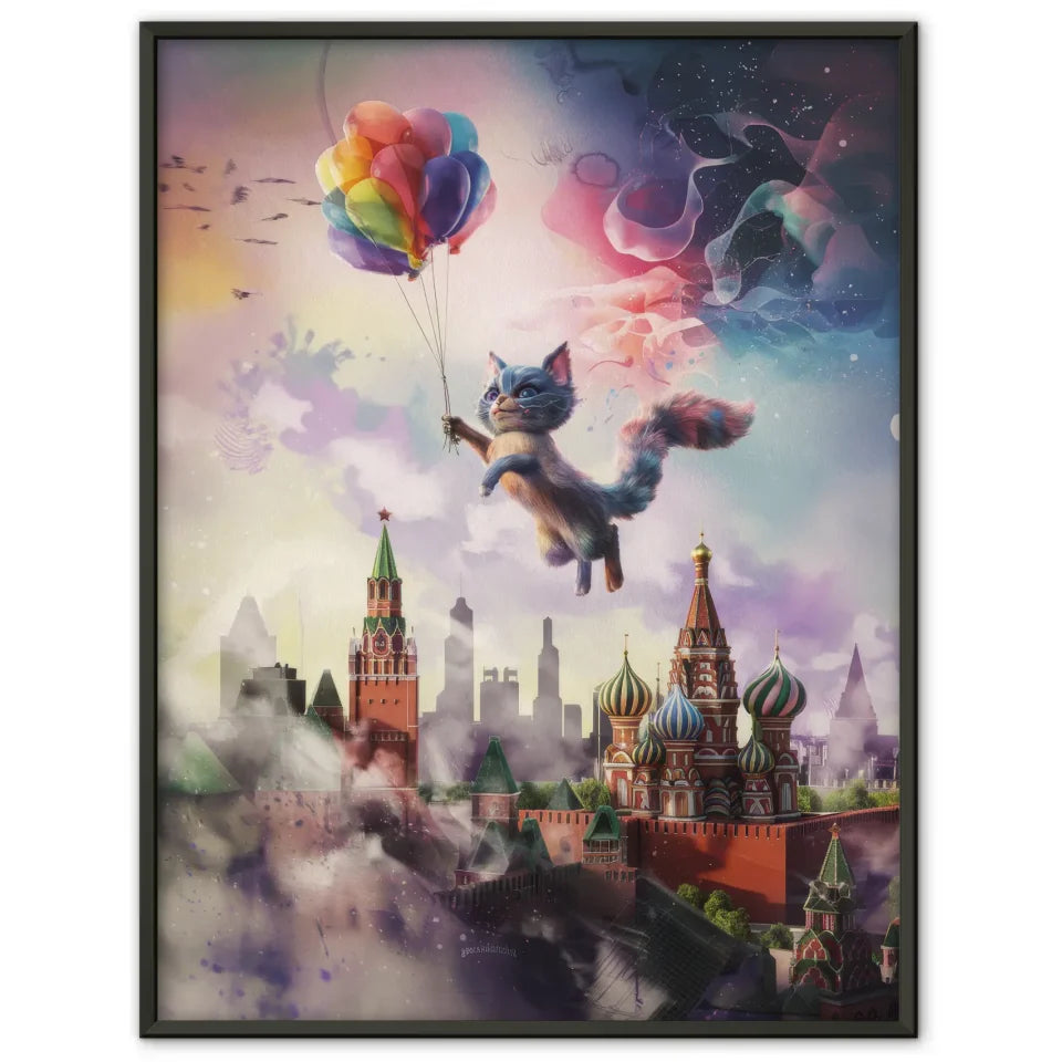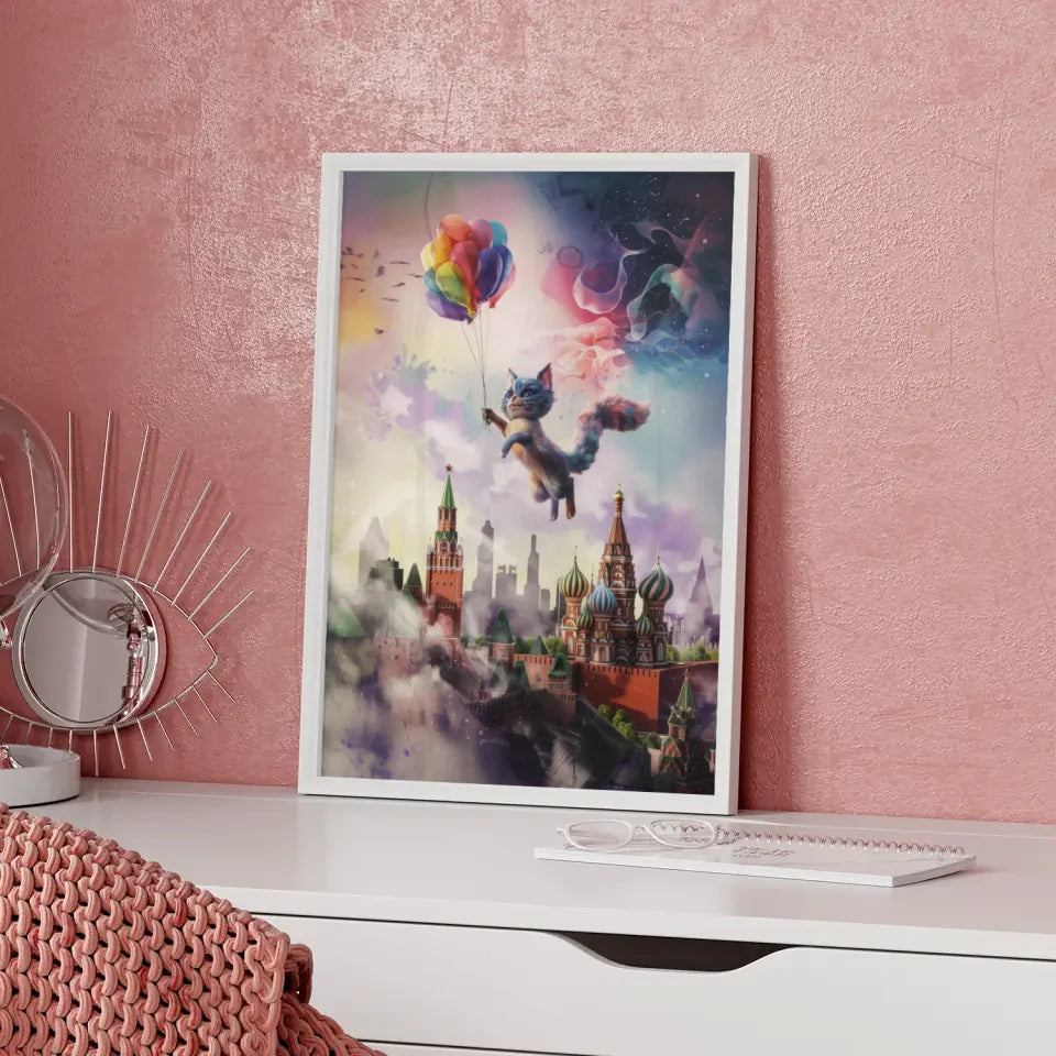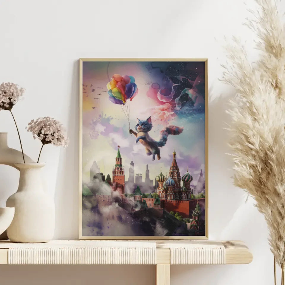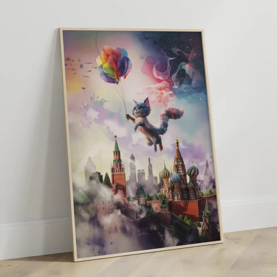 Entdecken Sie unser einzigartiges Wandbild, den künstlichen Poster mit surrealer Katzencreatur über Moskaus Skyline. Dieses außergewöhnliche Kunstwerk verbindet Tierdarstellung mit einer fantastischen 3D-Stildarstellung, die Ihre Wände zum Leben erweckt. Die katzenartige Kreatur schwebt anmutig über der ikonischen Skyline von Moskau und zieht alle Blicke auf sich. Der bunte Ballon, den sie hält, verleiht dem Poster eine verspielte Note.