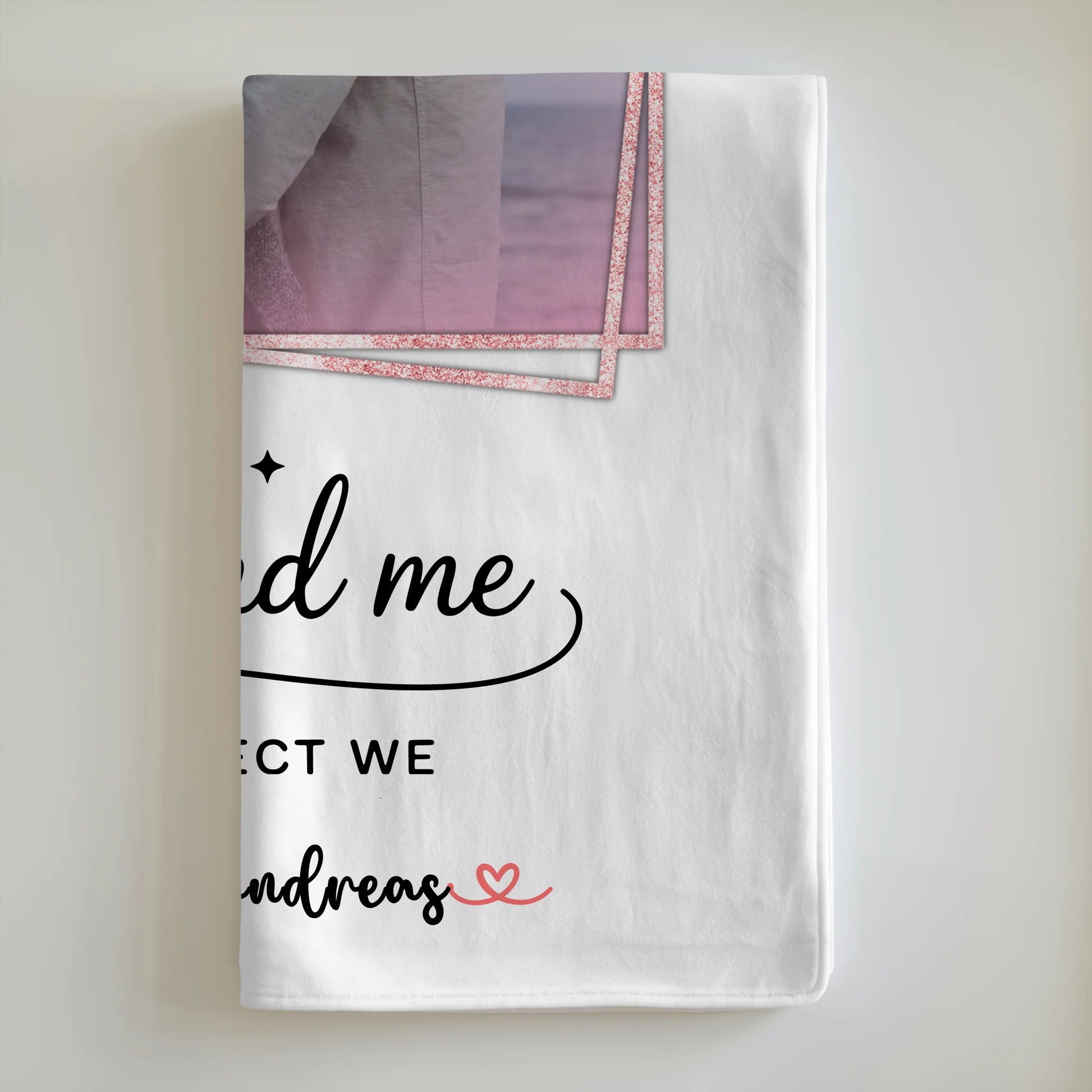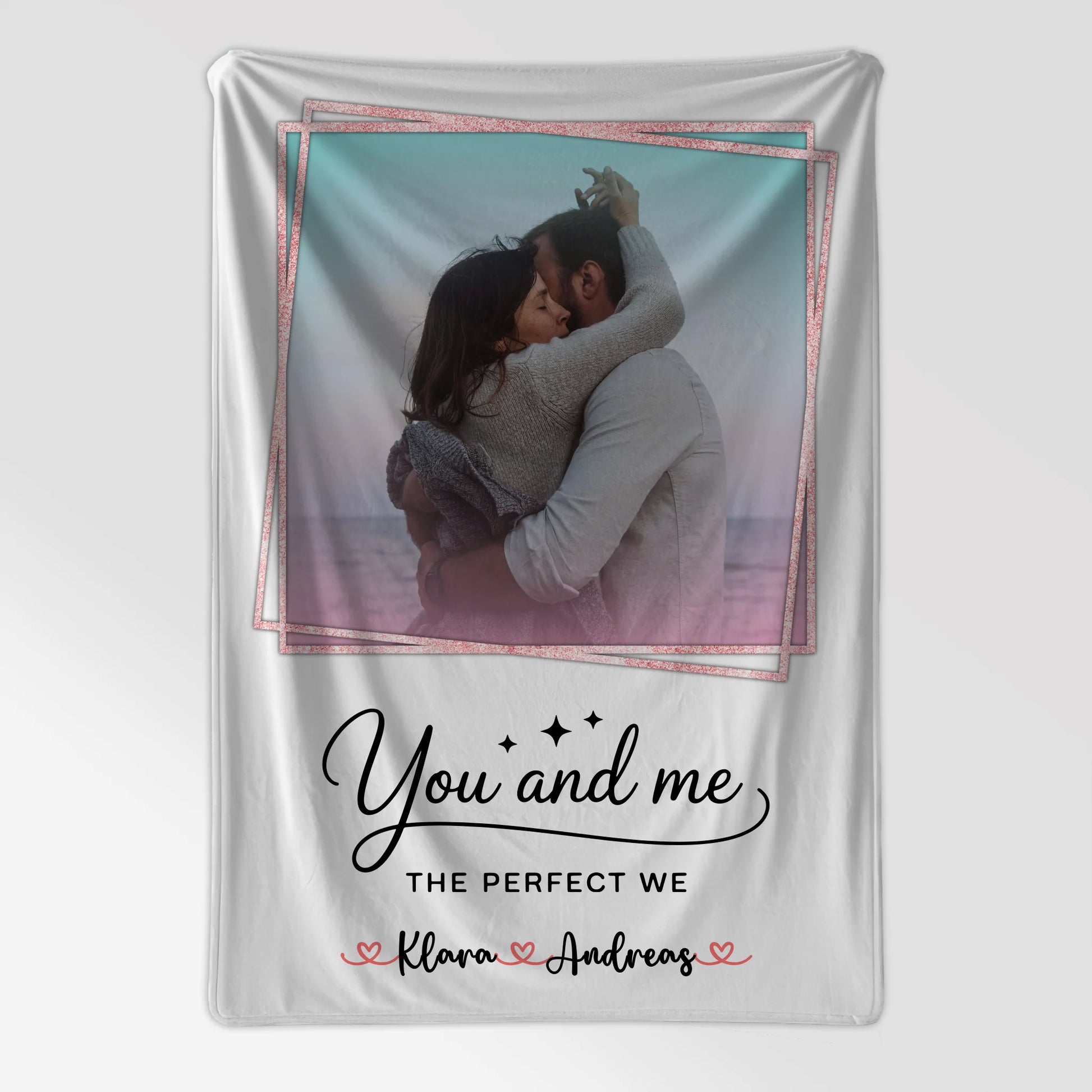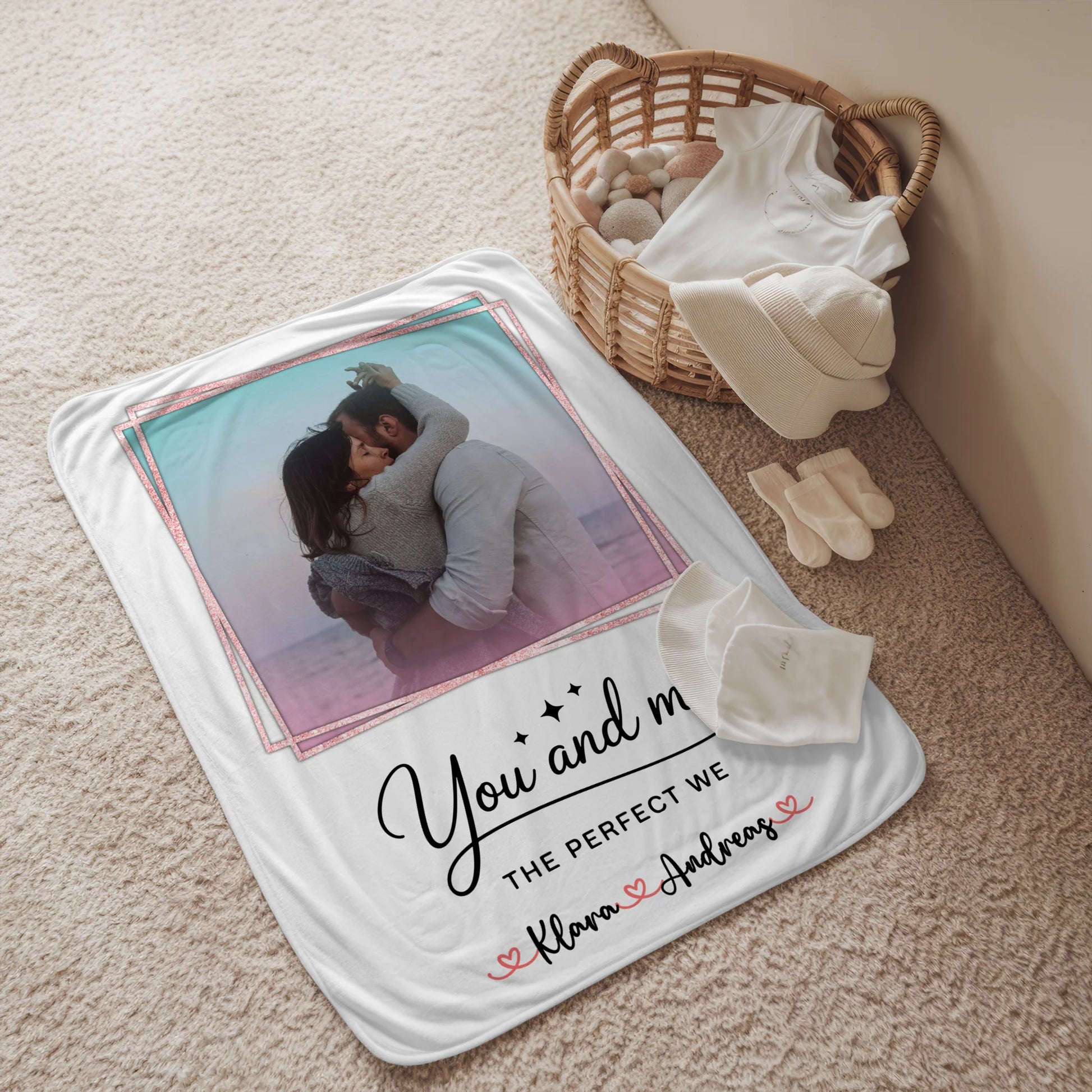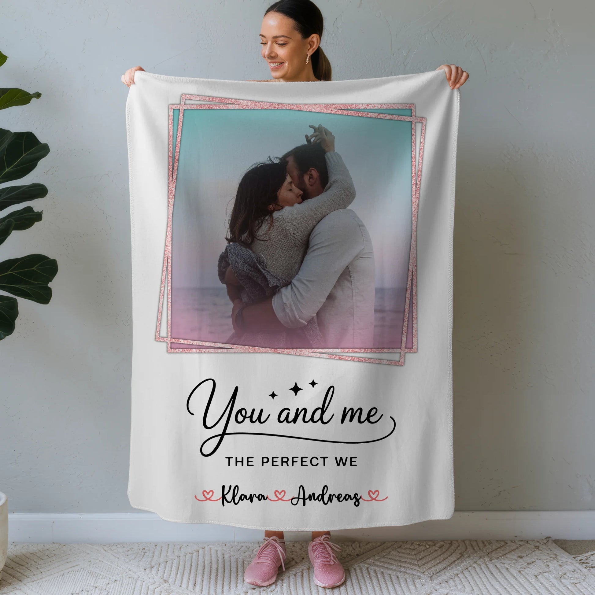 Entdecke die Kuscheldecke Mit Namen mit 1 Foto, Namen & Wunschtext für Paare You and me - eine hochwertige, personalisierte Decke, die dein Lieblingsfoto, eure Namen und einen persönlichen Spruch vereint und sich perfekt als romantisches Geschenk zum Valentinstag eignet.