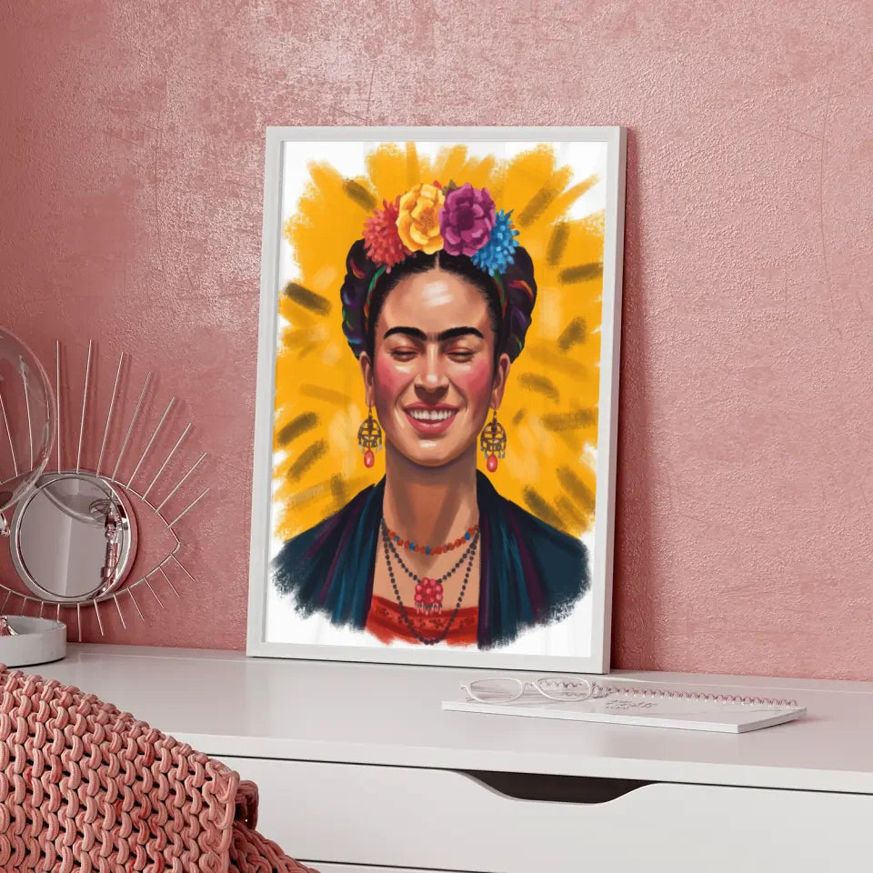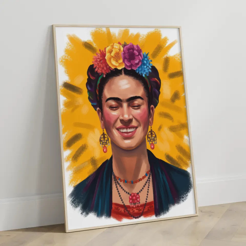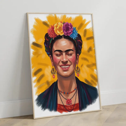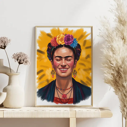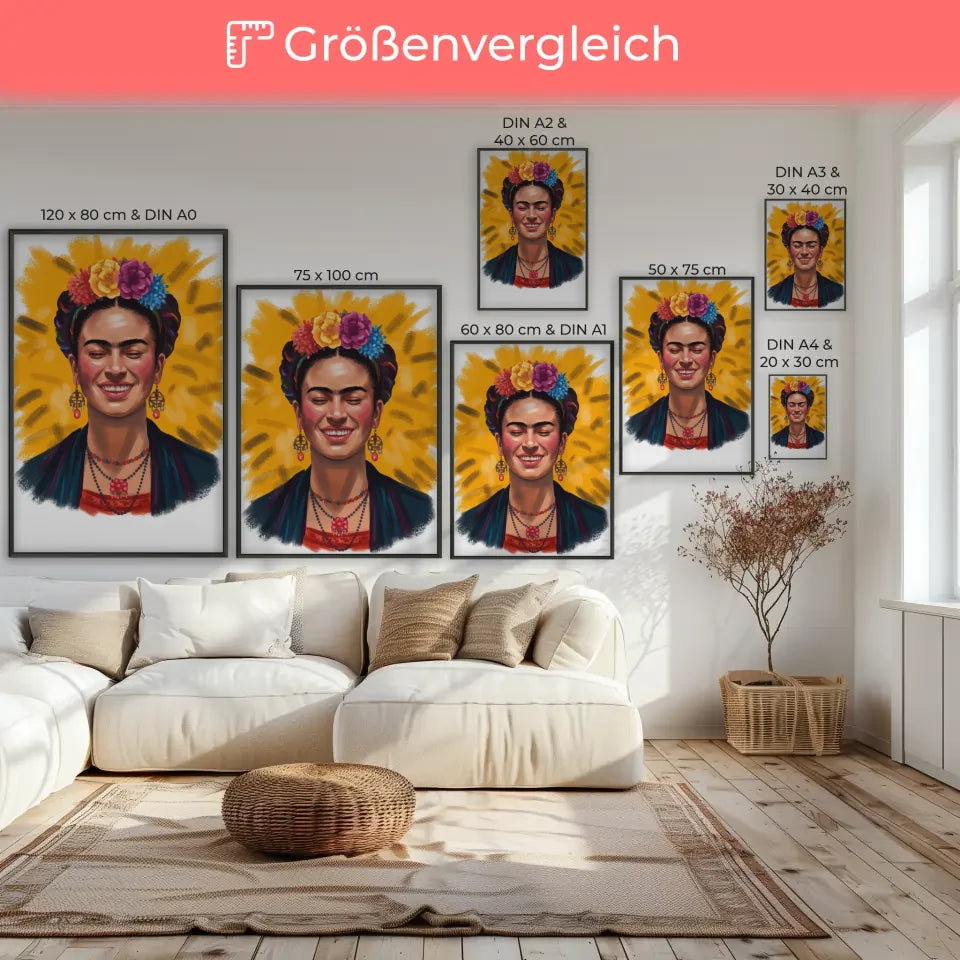 Verleihen Sie Ihrem Wohnraum mit unserem lebendigen Poster einer Frau mit Blumenkrone und strahlendem Lächeln einen Hauch von Kunst und Eleganz. Dieses eindrucksvolle Kunstwerk präsentiert eine Frau mit Frida-Kahlo-Abstammung, deren fröhliches Lächeln und leuchtende Augen eine Atmosphäre der Freude und Schönheit schaffen. Das Poster zeigt die Frau, geschmückt mit einer farbenfrohen Blumenkrone, die ihren Kopf ziert und ein Gefühl von Lebendigkeit und Vitalität vermittelt. Ihre aufwendigen Ohrringe und die traditionelle Kleidung lassen auf eine tief verwurzelte kulturelle Bedeutung schließen.