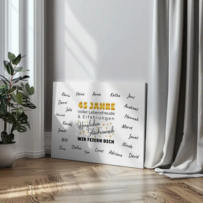 Du bist auf der Suche nach einem schönen tollen Geschenk? Dann ist Unsere Leinwand als Geschenkidee 45 Geburtstag Erfahrung mit Unterschriften ein tolles personalisiertes Geschenk.