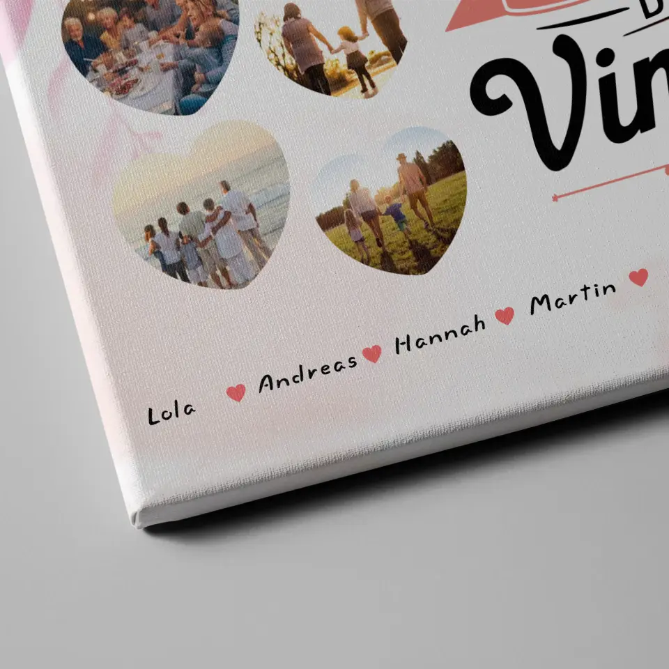 Du kannst bei diesem schönen Design 16 Fotos & 20 Namen ganz individuell personalisieren.