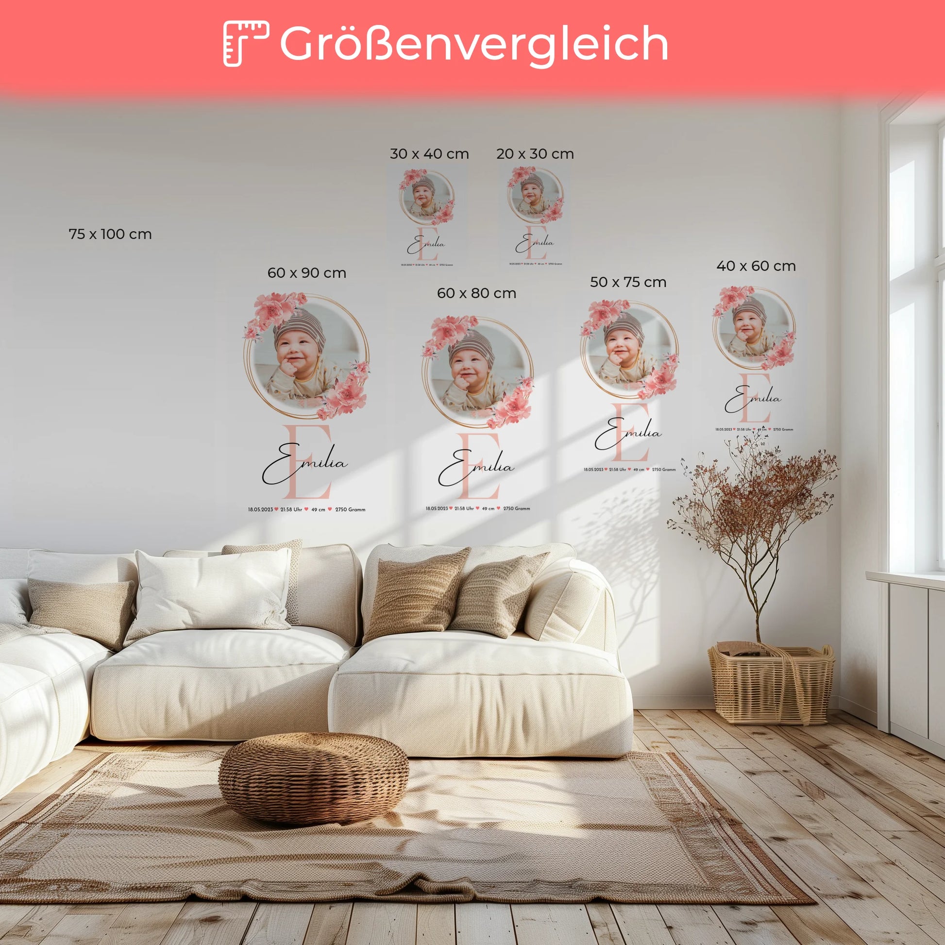 Personalisierbare Elemente: Geburtsdaten wie Gewicht Größe Uhrzeit und Datum, 1 Foto, Initial Buchstabe & Name. Du entscheidest, welche Details hervorgehoben werden und wie das Layout wirken soll.