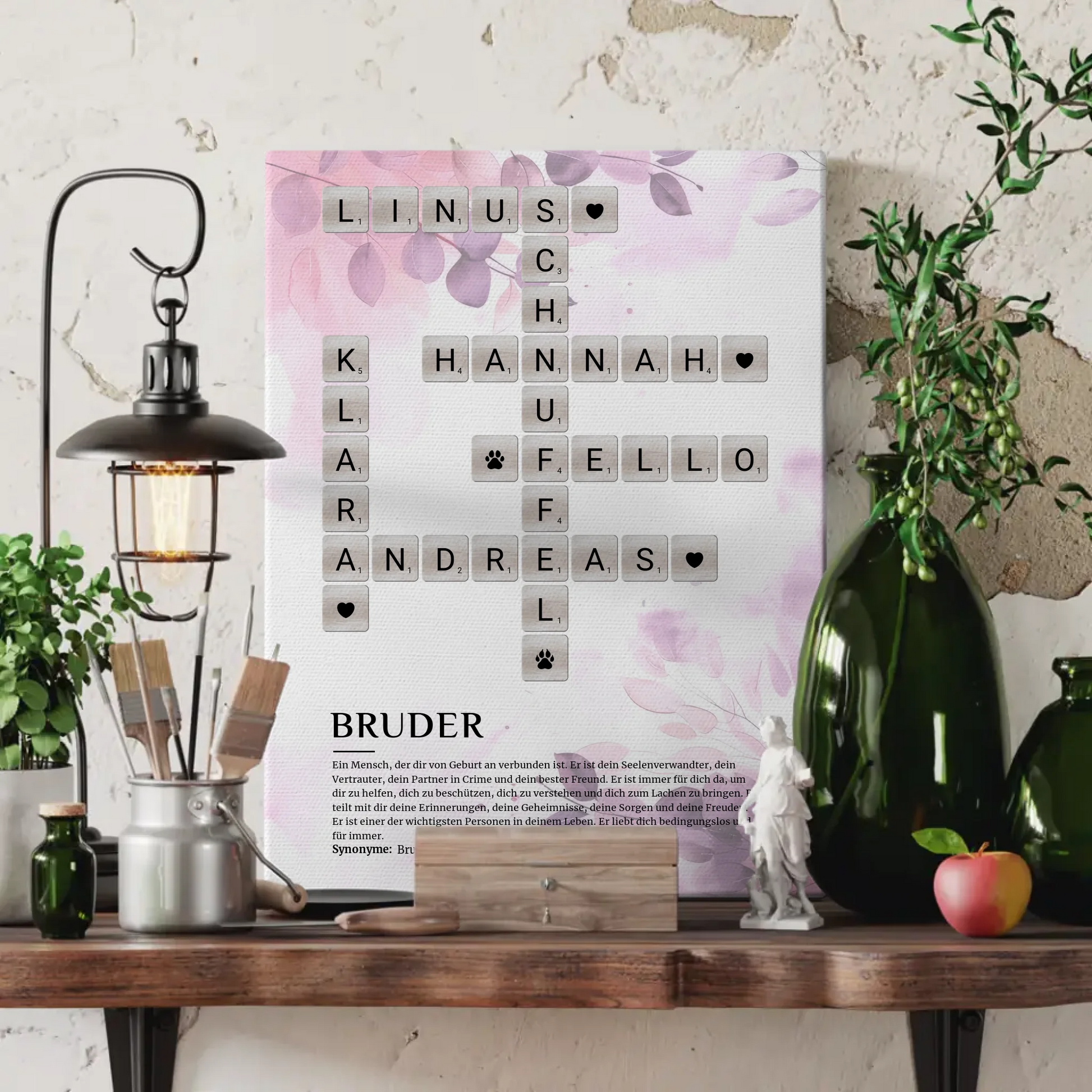 Gestalte das Kreuzworträtsel ganz nach deinen Vorstellungen: Du kannst seinen Namen hinzufügen und sogar das Hintergrundbild auswählen. So wird jedes Leinwand-Bild zu einem ganz besonderen Unikat, das die Verbindung zwischen dir und deinem Bruder feiert. Die Bruder Definition wird in liebevollem Design auf die Leinwand gebracht und ist ein echter Hingucker für jedes Zuhause.