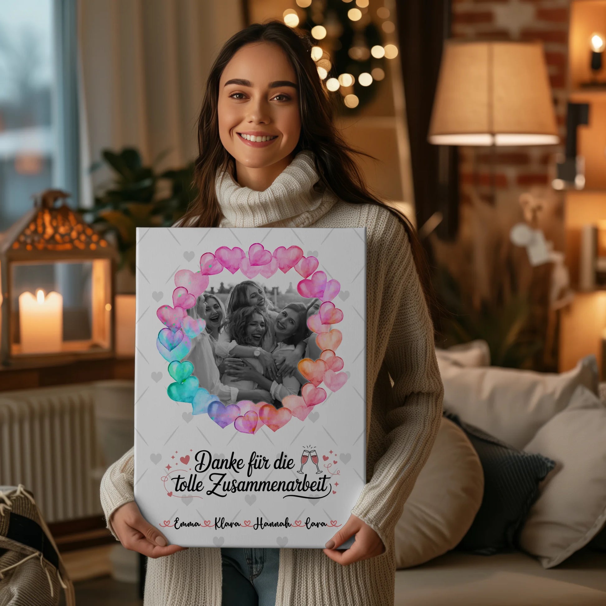 Du sitzt noch einmal am Schreibtisch, schaust das Foto vom letzten Team-Event an und erinnerst dich an die gemeinsamen Pausen, die Nervosität vor dem großen Abgabetermin und die stille Unterstützung deiner Kollegin an Tagen, die sonst grau gewesen wären. Genau diese Momente hält die Leinwand Collagen Erstellen mit Namen Foto Danke Kollegin für die Verabschiedung fest und verwandelt Erinnerungen in ein persönliches Dankeschön.