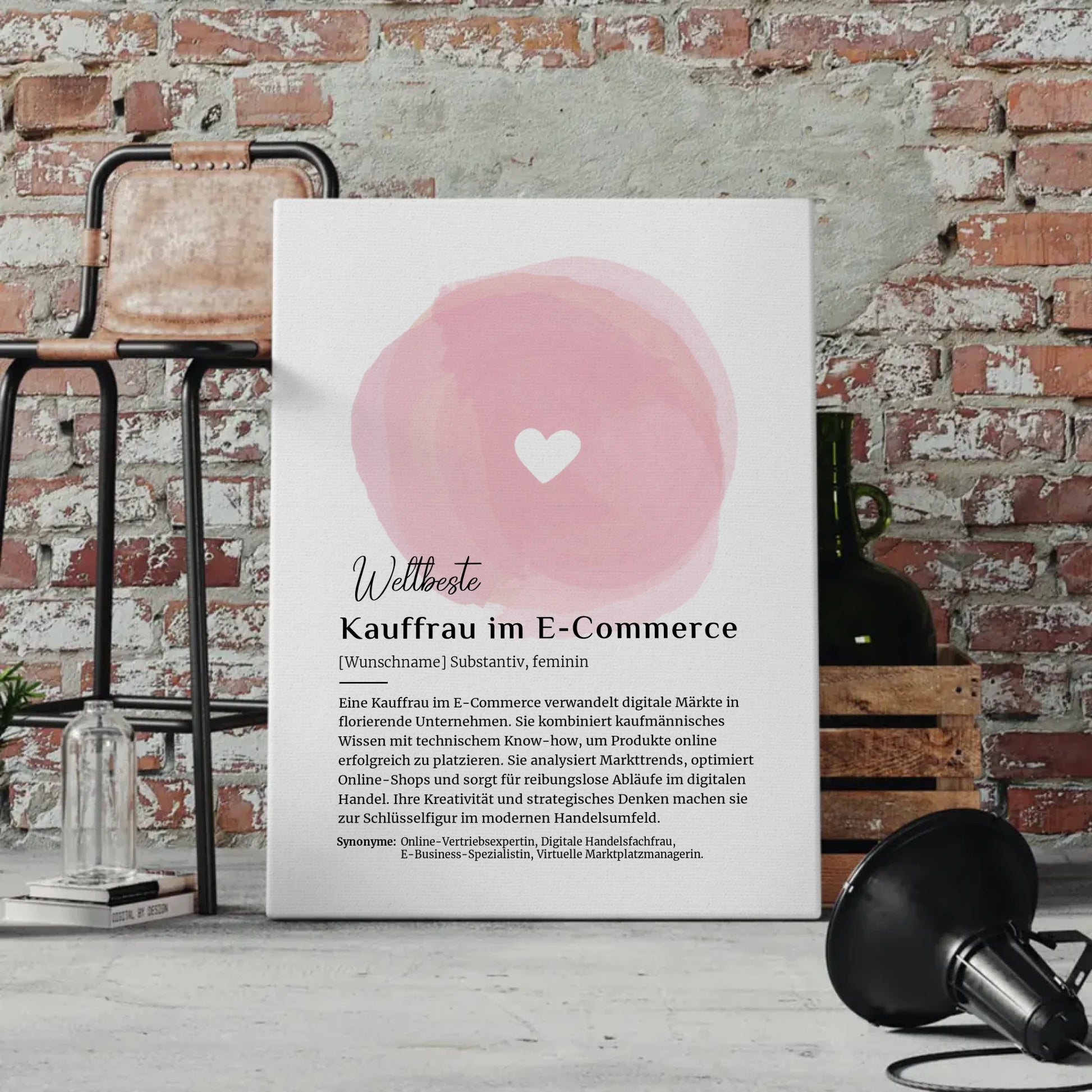 Die Leinwand Definition präsentiert auf kreative Weise die Rolle als Kauffrau im E-Commerce. Egal, ob du für eine Kollegin, Freundin oder einen Familienangehörigen suchst – dieses personalisierte Kunstwerk wird garantiert für Begeisterung sorgen. Mit der Option zur Personalisierung kannst du das Design individuell gestalten und so einem besonderen Menschen ein unvergessliches Andenken schenken.