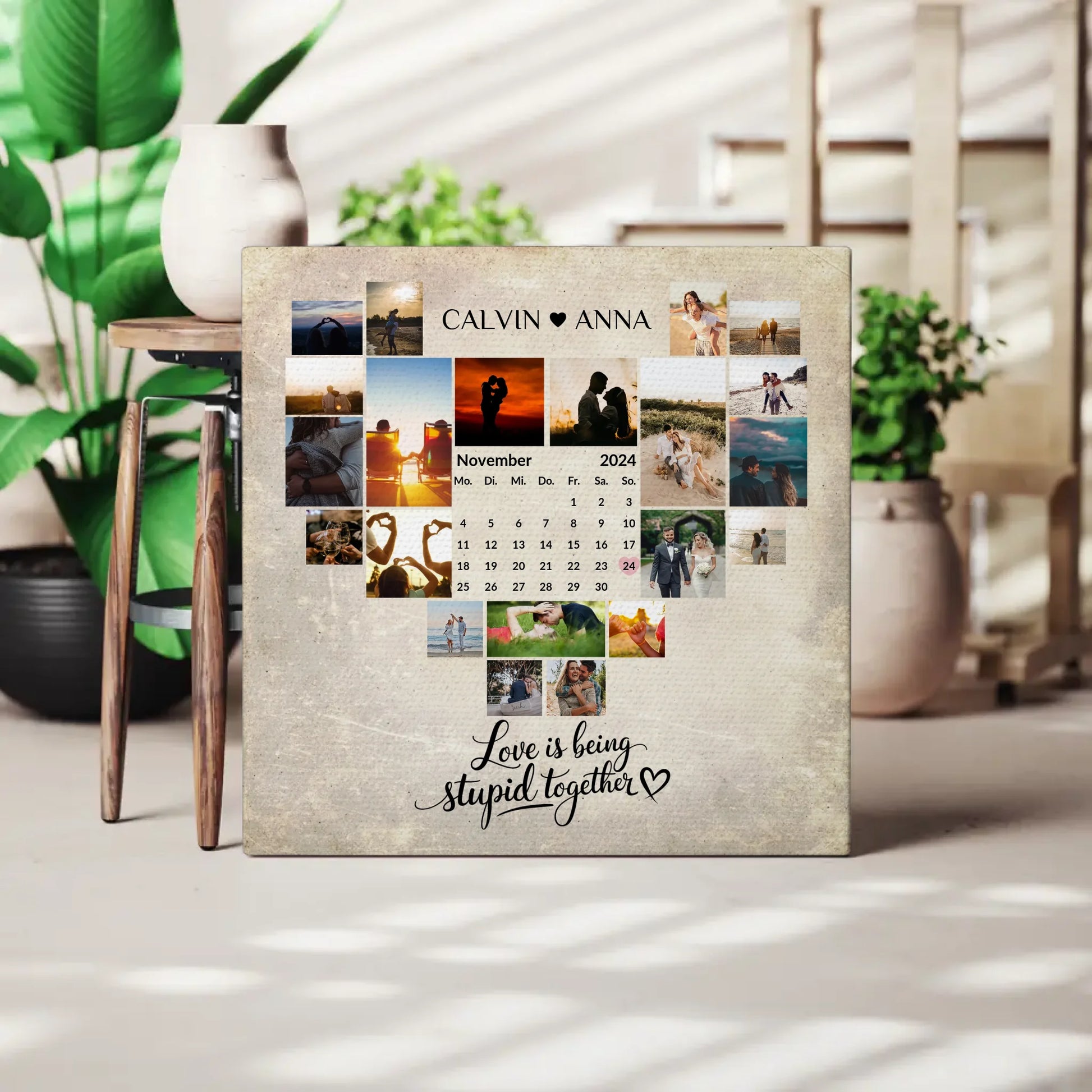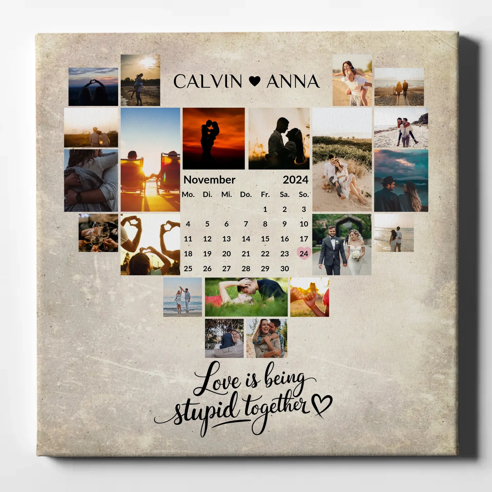 Die Leinwand Für Paare Fotocollage Love Is Being Stupid Together ist das perfekte Geschenk, um eure gemeinsame Liebe auf eine kreative Art und Weise festzuhalten. Mit dieser einzigartigen Fotocollage kannst du über 20+ Fotos einfügen, die eure schönsten Momente dokumentieren. Außerdem hast du die Möglichkeit, das Datum eures besonderen Tages sowie eure Namen und ein Hintergrundbild zu wählen, ganz nach euren individuellen Vorstellungen.