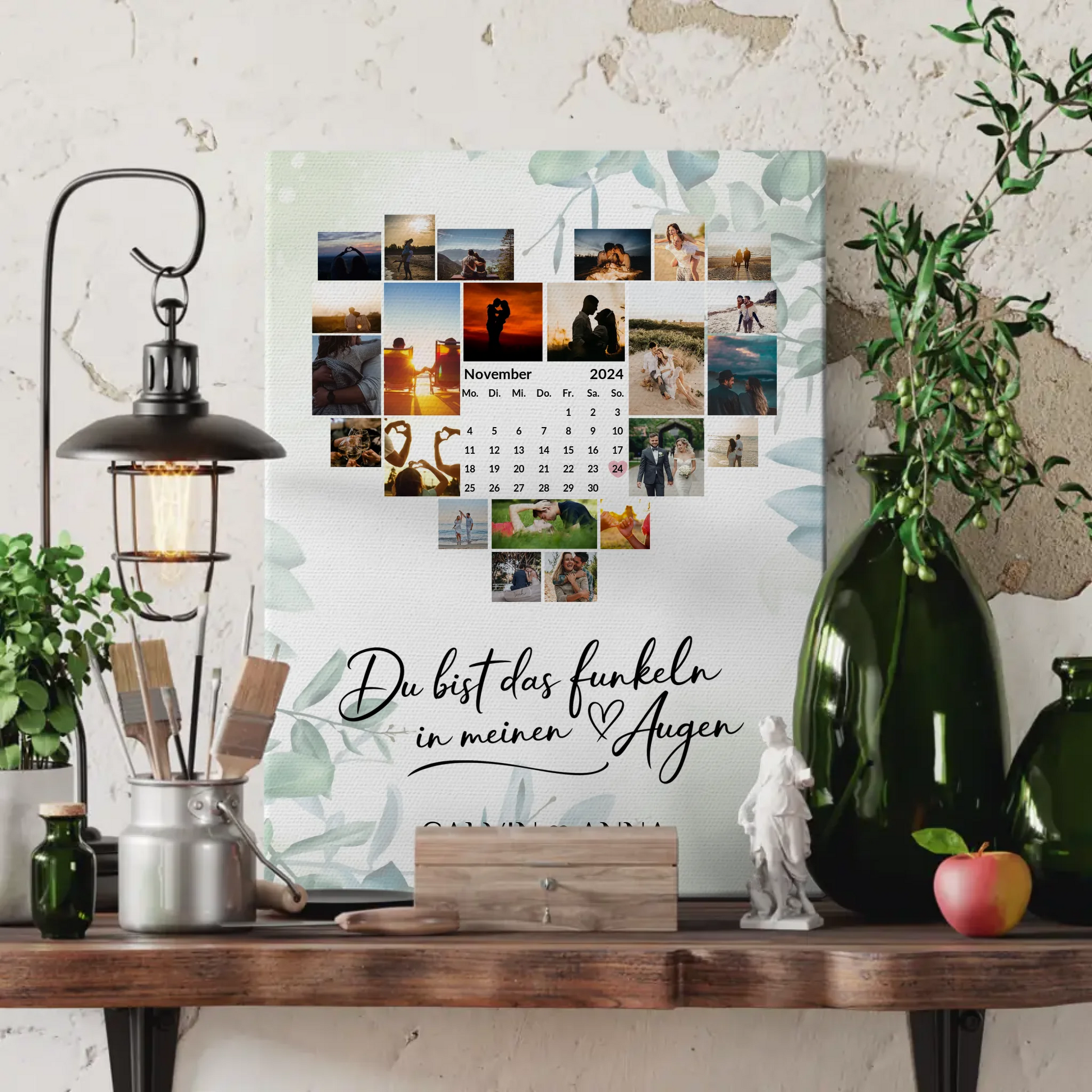 Überrasche deine Liebsten mit der einzigartigen Leinwand Liebe Fotocollage Du Bist Das Funkeln Geschenk! Dieses personalisierte Leinwand Kunstwerk bietet dir die Möglichkeit, über 20+ Fotos in einem traumhaften Design zu vereinen. Gestalte eine ganz persönliche LiebesLeinwand, indem du wichtige Namen, ein besonderes Datum und ein Hintergrundbild deiner Wahl integrierst. Egal ob zum Valentinstag oder einfach als liebevolle Geste – dieses Geschenk ist die perfekte Geschenkidee für alle romantischen Anlässe!