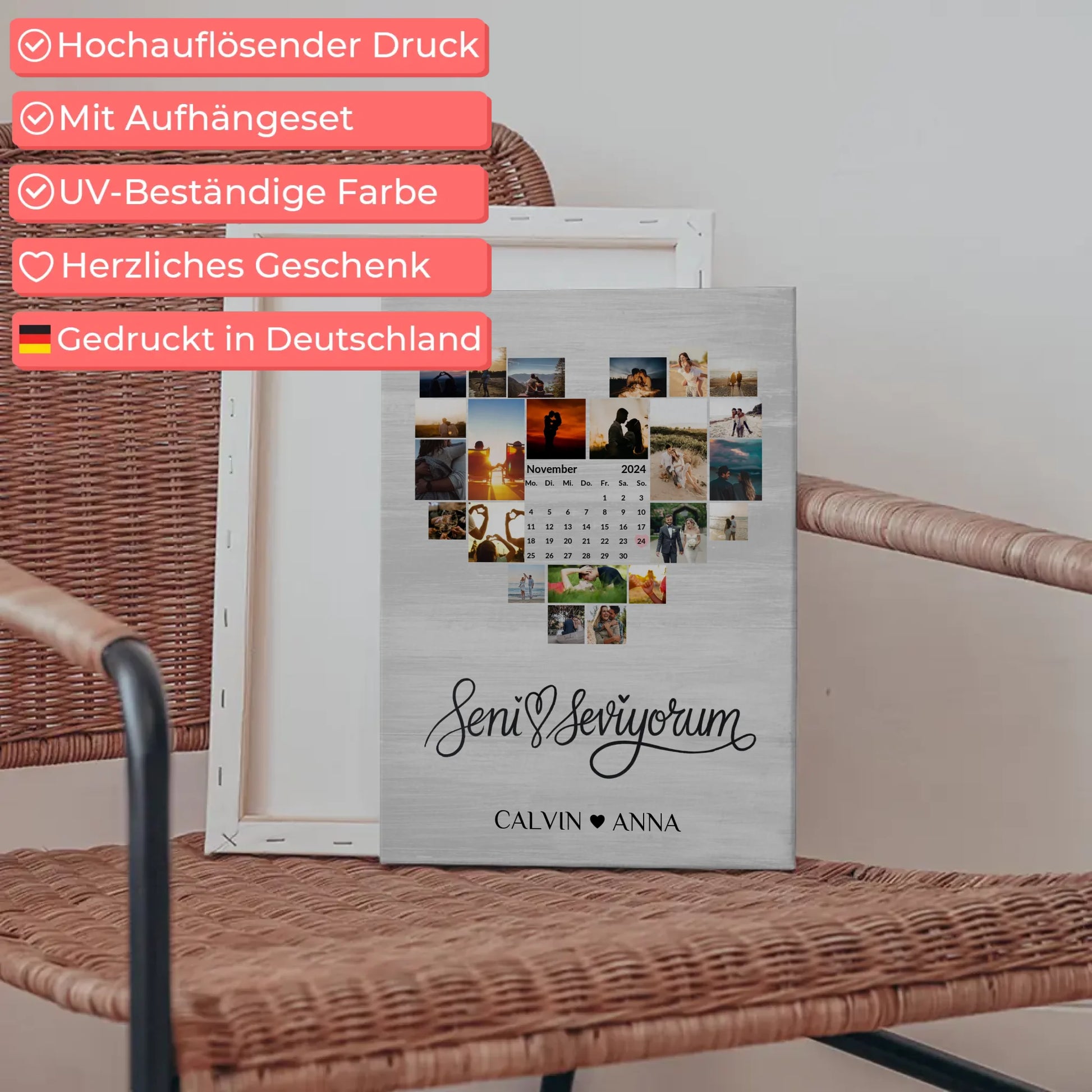 Zeige deine Liebe mit dieser einzigartigen personalisierten Leinwand, die nicht nur ein Blickfang in jedem Raum ist, sondern auch die schönsten Erinnerungen festhält. Mit dem liebevollen Spruch Seni Seviyorum (Ich liebe dich) wird dieses Kunstwerk zu einer emotionalen Bereicherung für dein Zuhause.