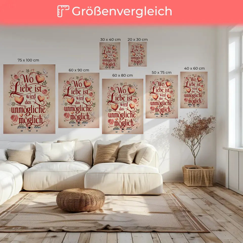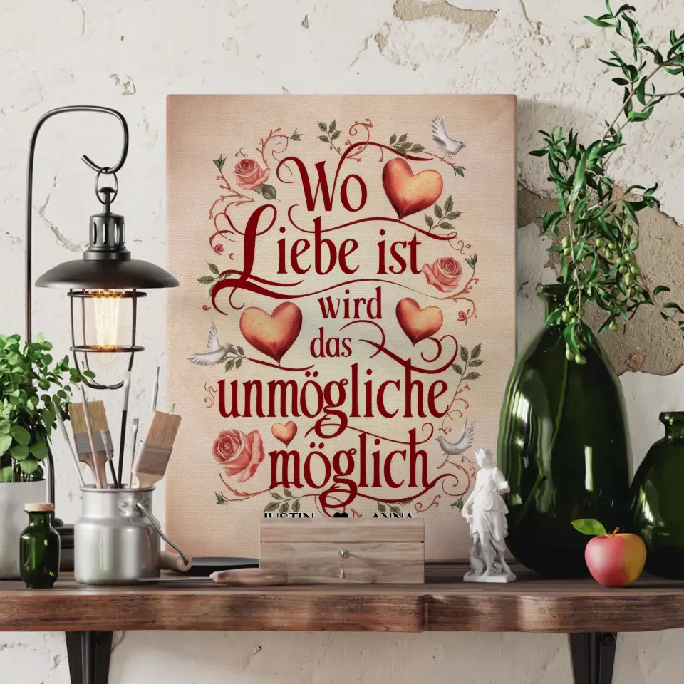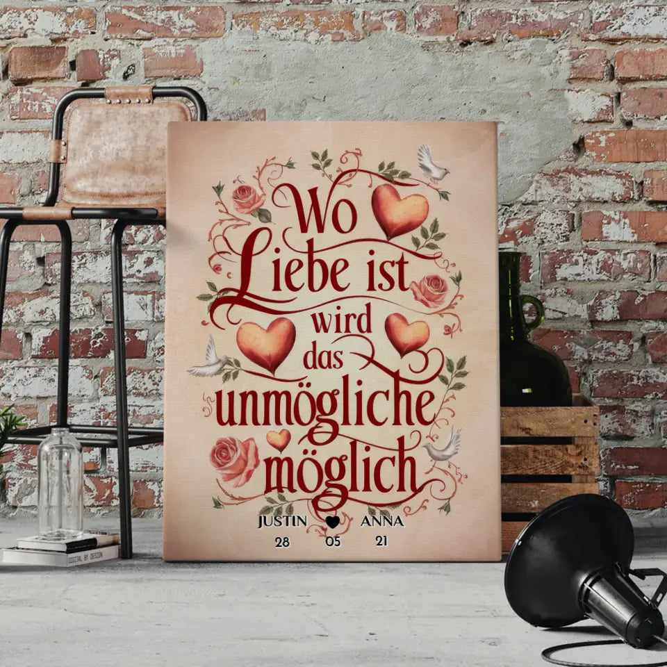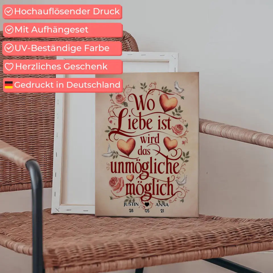 Du möchtest etwas einzigartiges verschenken? Dann ist Unsere Leinwand Liebe Wo Liebe Ist Wird Das Unmögliche Möglich Personalisiert ein wunderschönes personalisiertes Geschenk.