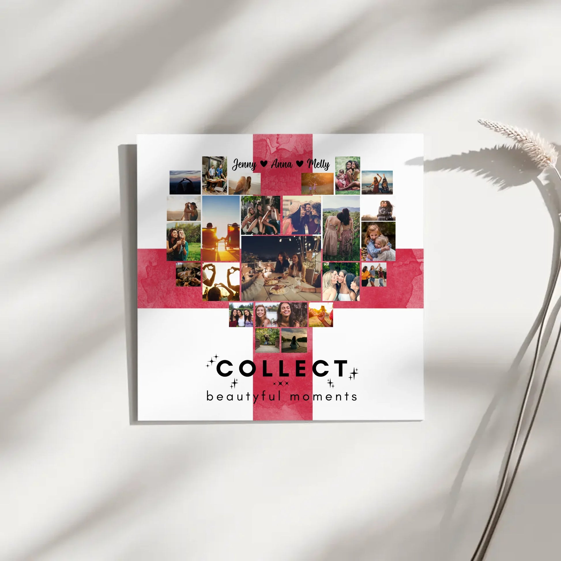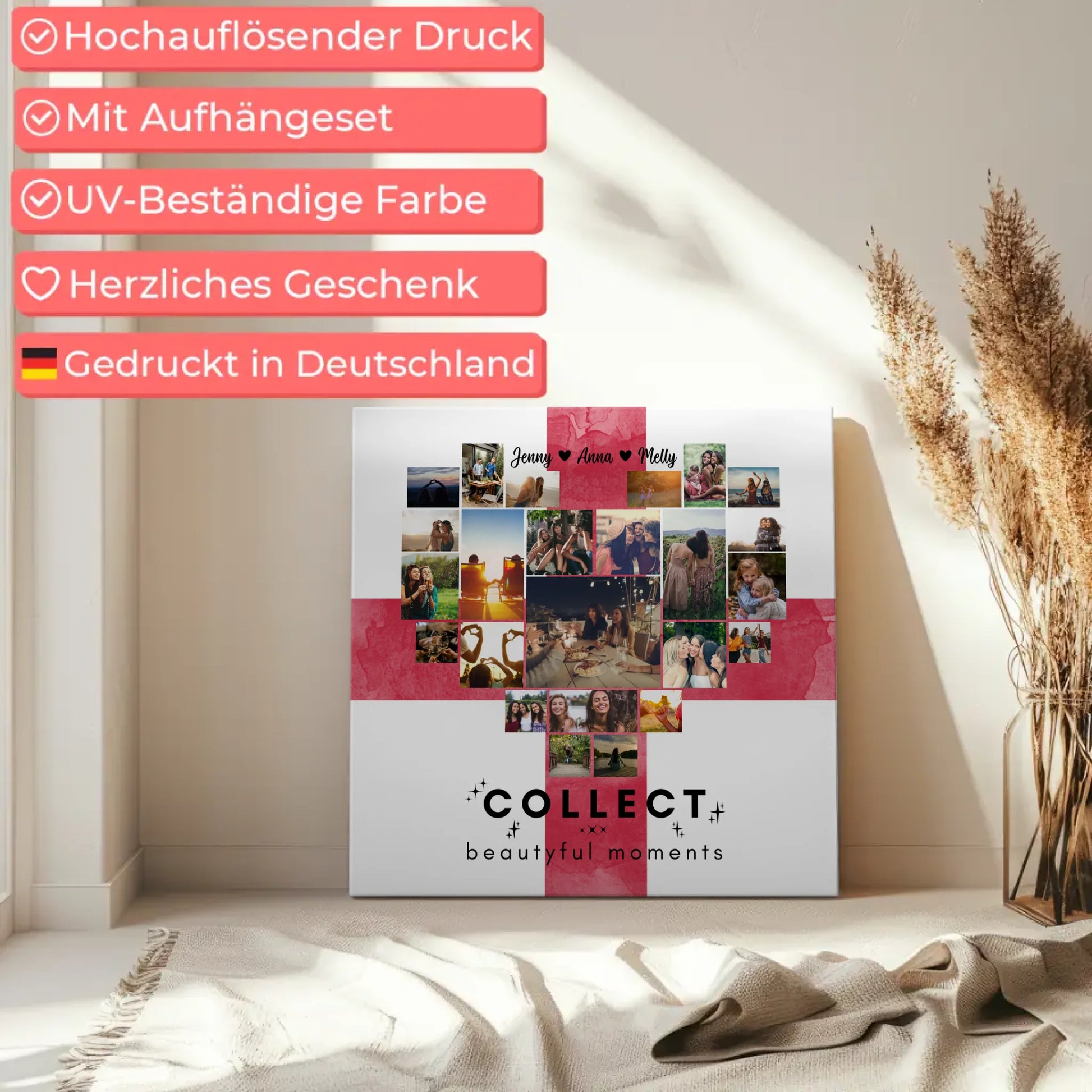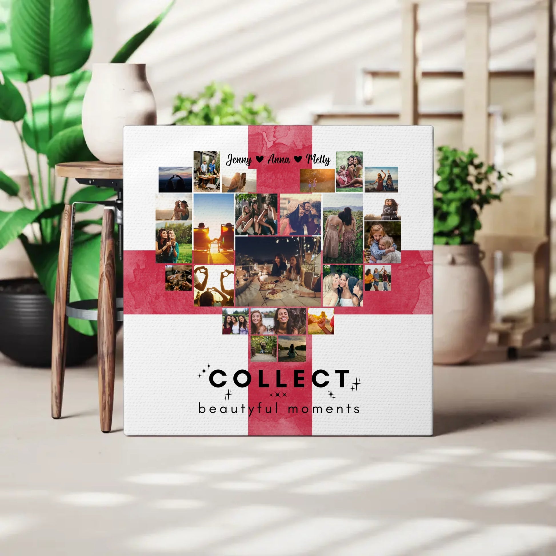 Mithilfe unserer benutzerfreundlichen Gestaltungsmöglichkeiten kannst du über 20+ deiner besten Urlaubserinnerungen auswählen und auf der Leinwand verewigen. Wähle einen persönlichen Namen, ein passendes Hintergrundbild und füge einen eigenen Spruch oder Wunschtext hinzu - vielleicht hast du ja den schönen Spruch 'Collect Beautiful Moments' im Kopf!