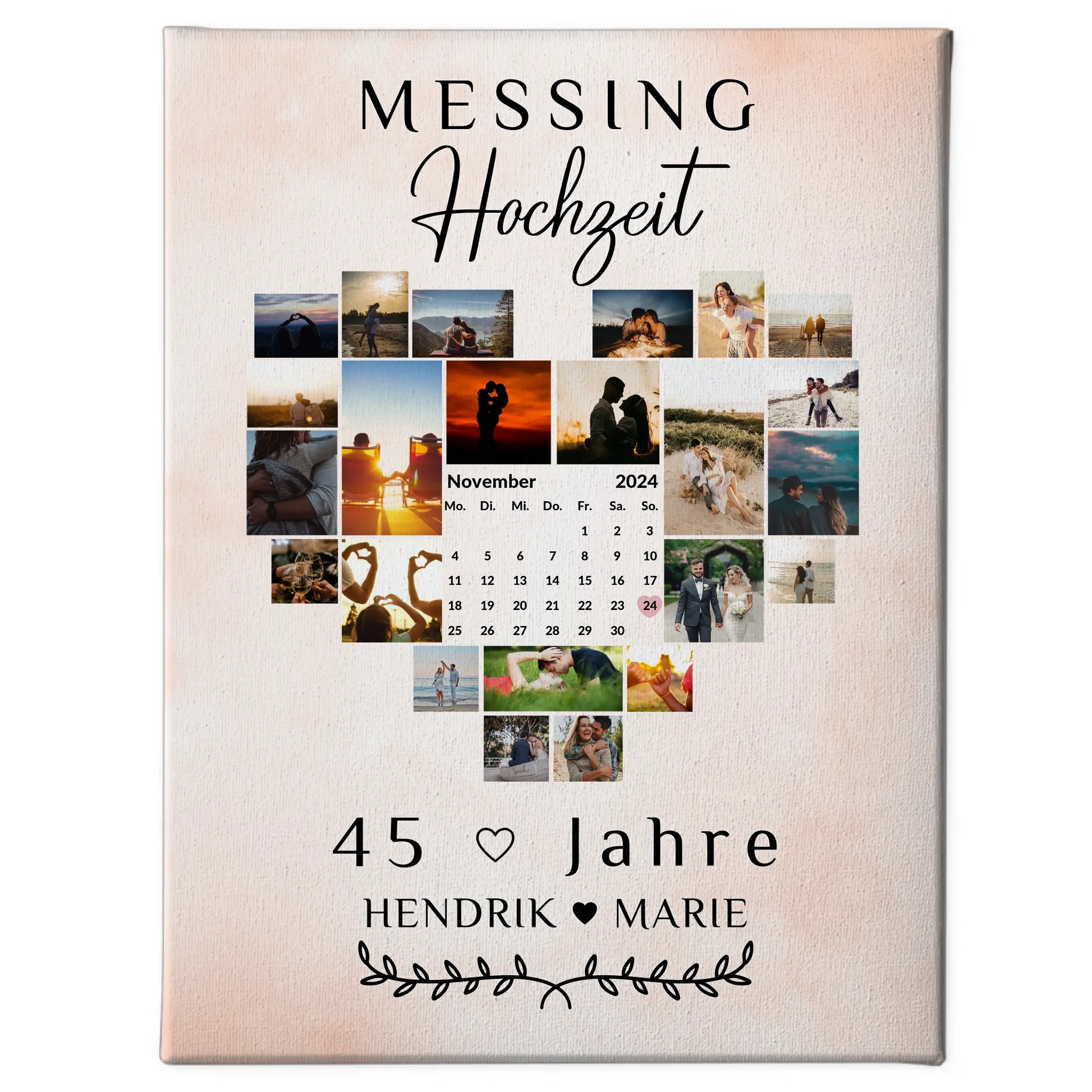 Feiere den besonderen 45. Hochzeitstag mit unserer einzigartigen Leinwand mit Kalender. Dieses personalisierte Geschenk für die Messinghochzeit ist eine wundervolle Erinnerung an viele gemeinsame Jahre. Gestalte deine Leinwand ganz nach deinen Vorstellungen und wähle aus über 20+ Fotos, Namen und einem Hintergrundbild, um das ideale hochzeitstag geschenk zu kreieren.
