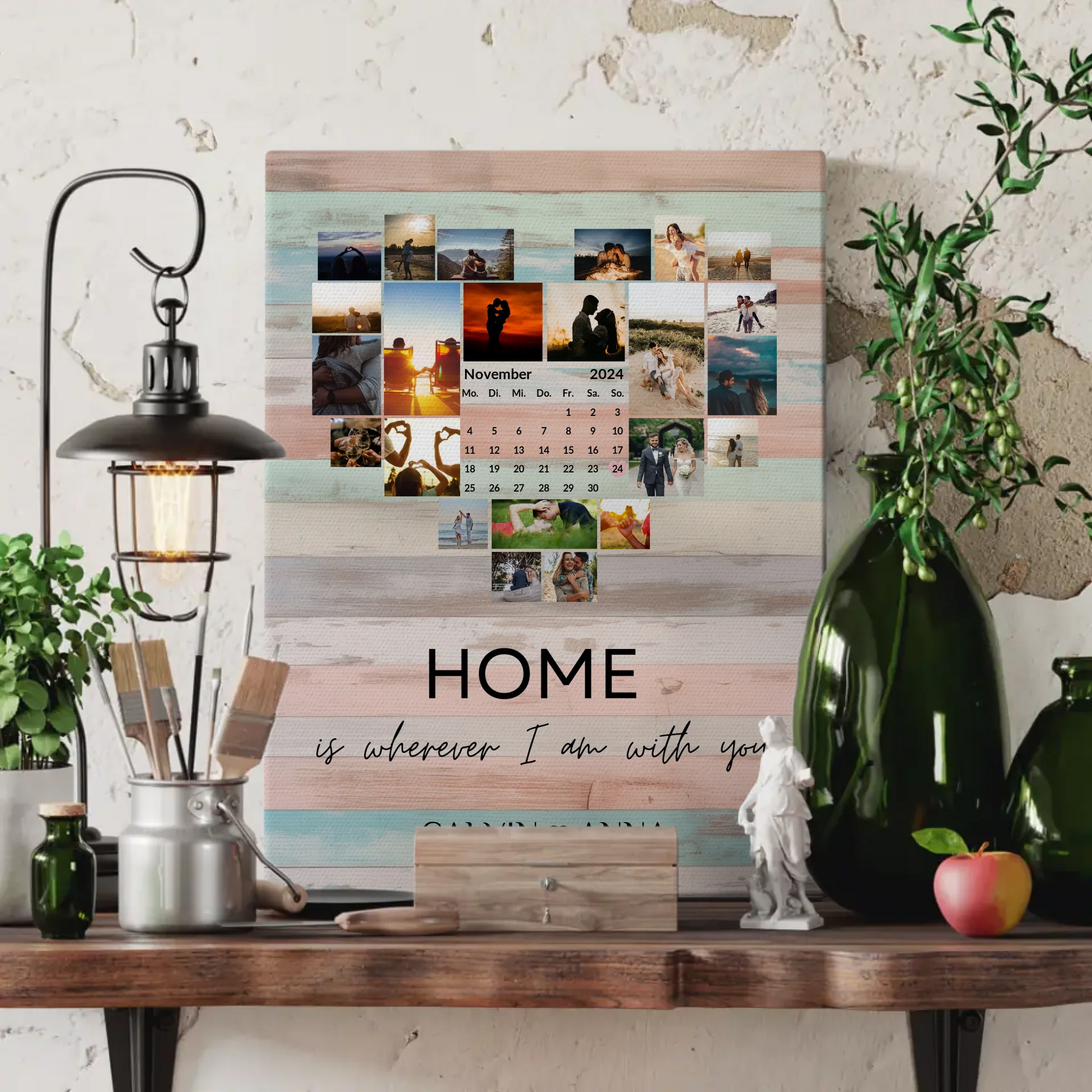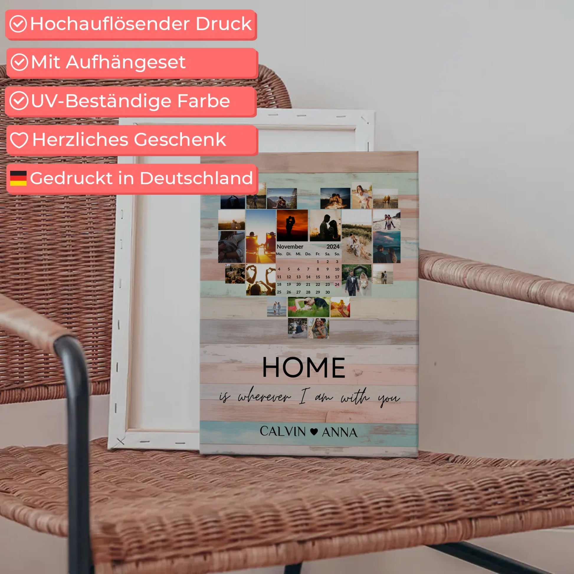 Entdecke die perfekte Geschenkidee für den Valentinstag mit unserer personalisierten Leinwand 'Leinwand Paare Fotocollage Home Is Wherever I Am With You“. Diese liebevolle Leinwand bietet dir die Möglichkeit, über 20+ Fotos, Namen und ein Datum sowie ein individuelles Hintergrundbild zu integrieren. So wird jede Leinwand zum ganz persönlichen Meisterwerk deiner gemeinsamen Geschichte.