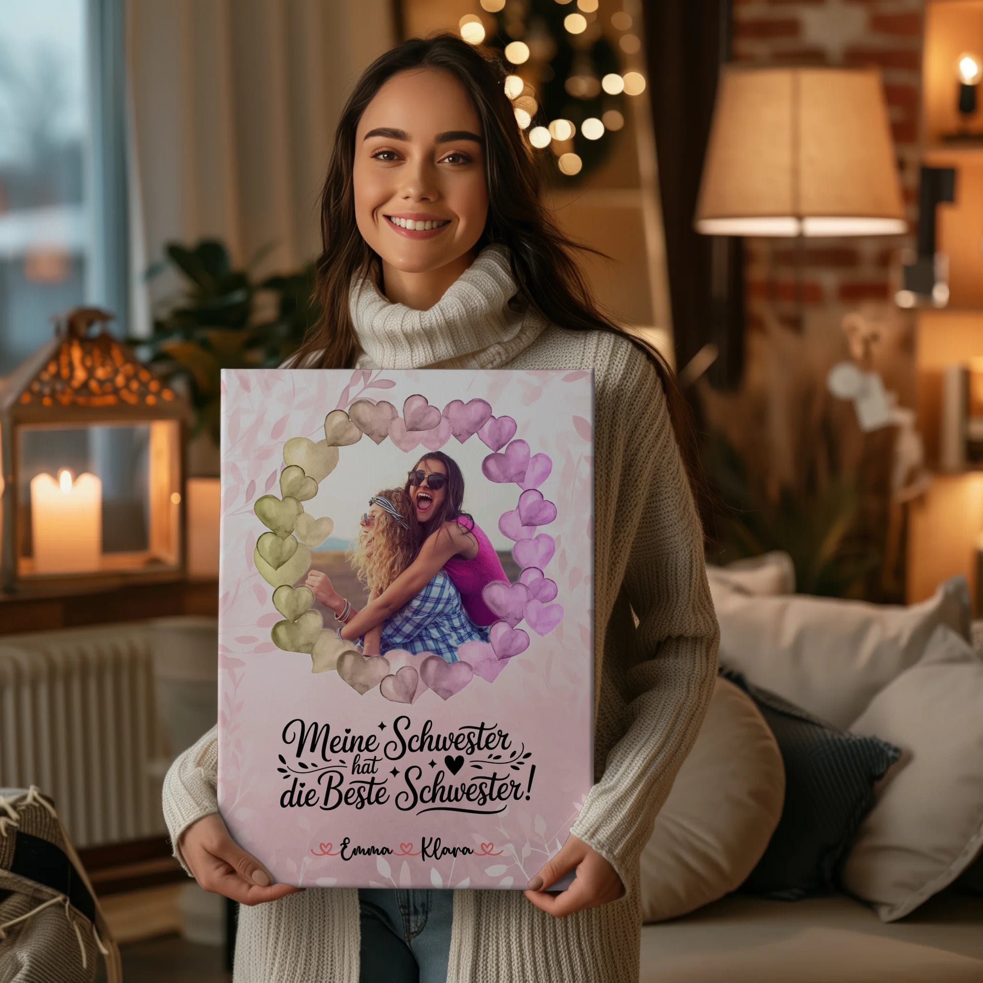 Überrasche deine Schwester mit einer liebevollen, personalisierten Leinwand, die Foto, Namen und deinen Wunschtext zu einem einzigartigen Kunstwerk verbindet und perfekt als Geschenk zum Geburtstag geeignet ist.