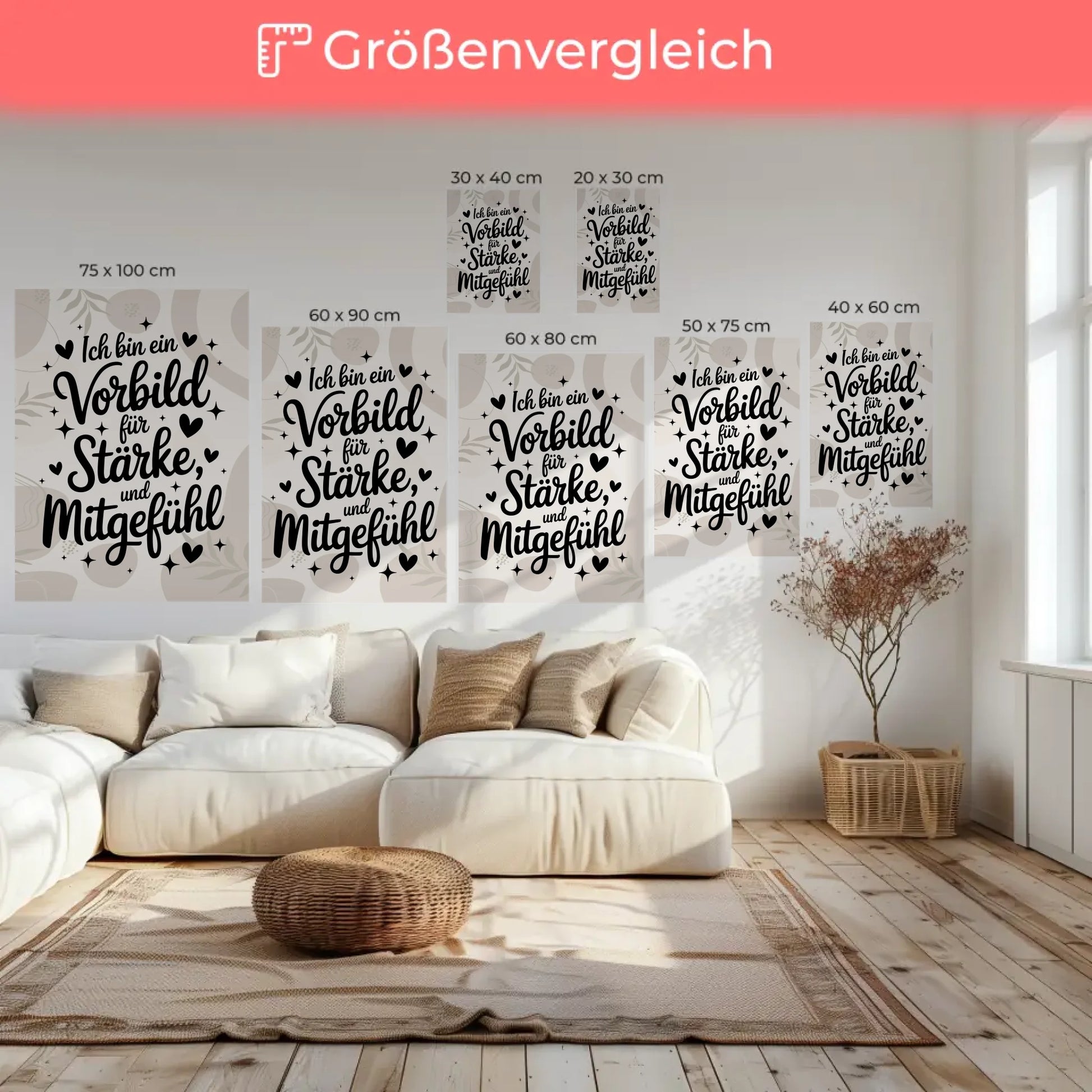 Entdecke die kraftvolle Leinwand Spruch Affirmation 'Ich bin ein Vorbild fĂŒr Liebe, StĂ€rke und MitgefĂŒhlâ. Dieses personalisierte Kunstwerk ist nicht nur ein echter Hingucker, sondern auch eine tĂ€gliche Motivation, die positiven Gedanken in dein Leben zu bringen. Egal ob zu Weihnachten, Geburtstagen oder einfach als kleine Aufmerksamkeit â dieses Geschenk erfĂŒllt jeden Anlass mit Liebe und WĂ€rme.