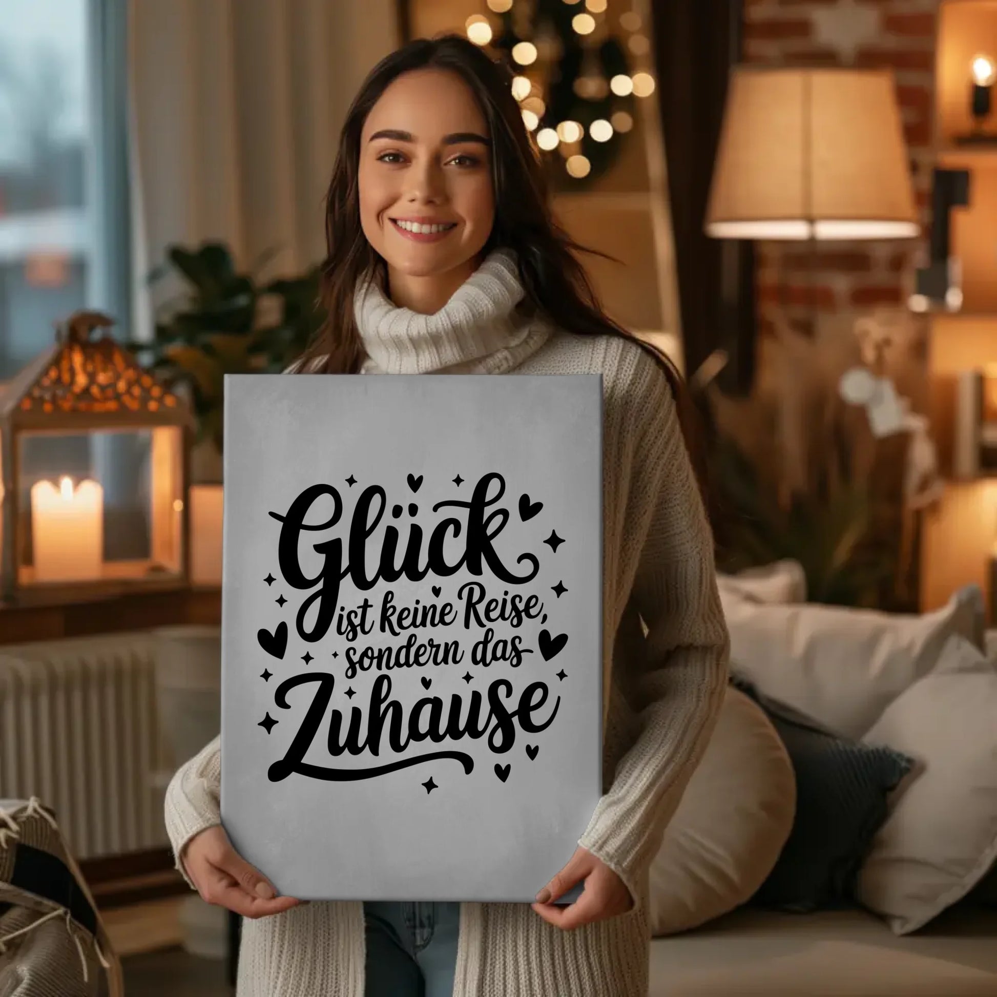 Mache jetzt den ersten Schritt zur Verwirklichung deiner individuellen Motivationssprüche Leinwand. Bestelle noch heute deine personalisierte Leinwand 'Glück ist keine Reise, sondern das Zuhause' und bringe Freude in dein Leben oder das Leben deiner Liebsten!