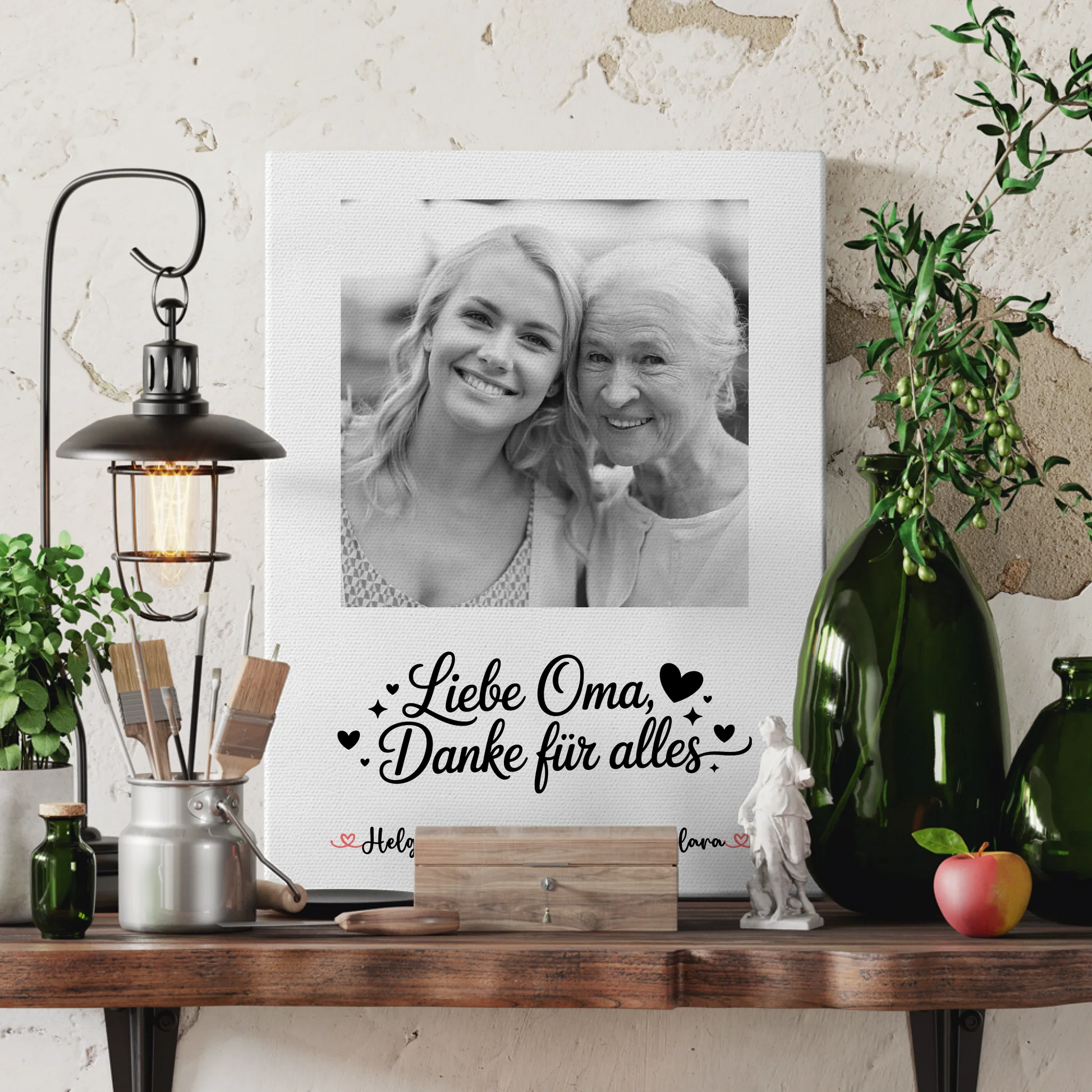 Stell dir vor, wie deine Oma an Muttertag die Tür öffnet und ihr Blick an einem ganz persönlichen Leinwand Wandbild hängen bleibt. Dieses personalisierte Leinwand Wandbild verbindet ein Lieblingsfoto, ihren Namen und einen liebevollen Spruch zu einem zeitlosen Andenken, das sowohl in Schwarz & Weiß als auch farbig zur Geltung kommt. Perfekt für Oma, die Erinnerungen und ehrliche Worte schätzt, und ideal als Geschenk zum Muttertag.