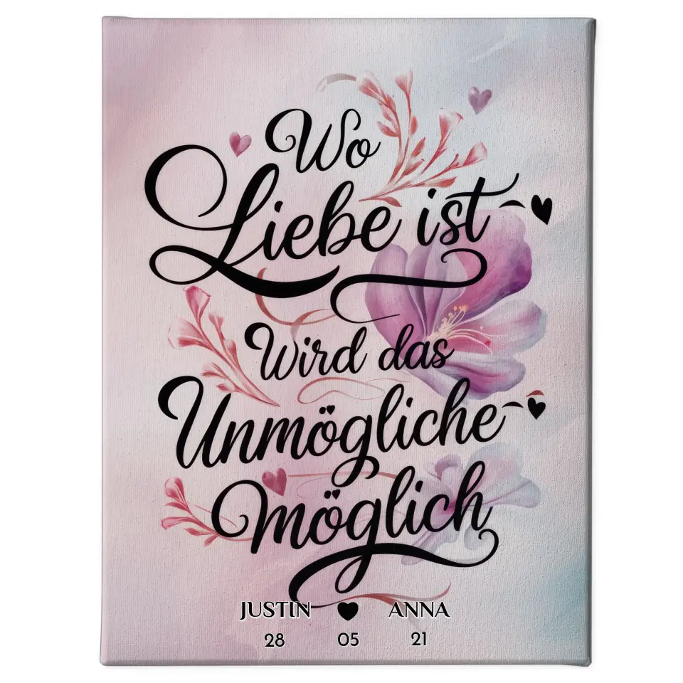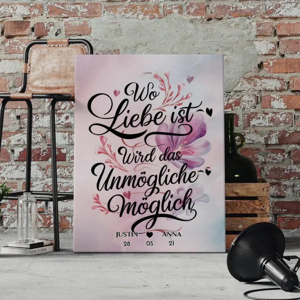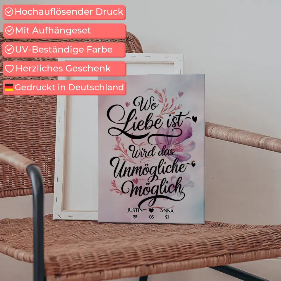 Du möchtest mal wieder etwas einzigartiges verschenken? Unsere Leinwand Wo Liebe Ist Wird Das Unmögliche Möglich Personalisiert ein richtig schönes personalisiertes Geschenk.
