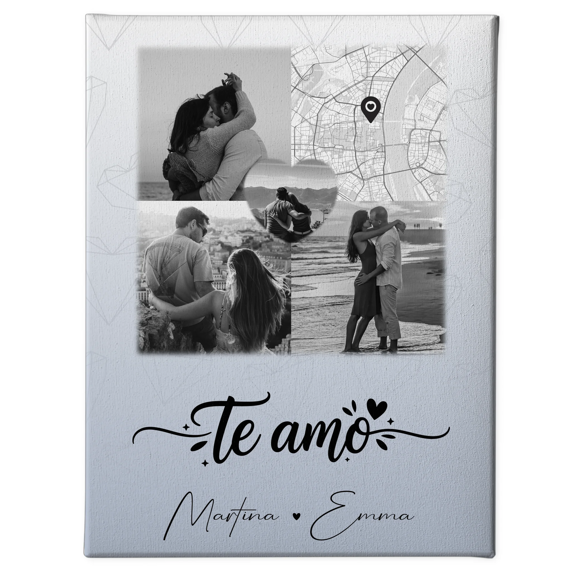 Suchst du nach einem einzigartigen Geschenk, das eure Liebe auf kreative und emotionale Weise zum Ausdruck bringt? Unser Leinwandbild Paar mit 3 Fotos und Herz Foto Karte Te amo Liebe auf Spanisch ist die ideale Wahl, um eure schönsten Momente festzuhalten. Dieses personalisierte Kunstwerk verbindet eure Erinnerungen in einem stilvollen Design und macht euer Zuhause noch persönlicher.
