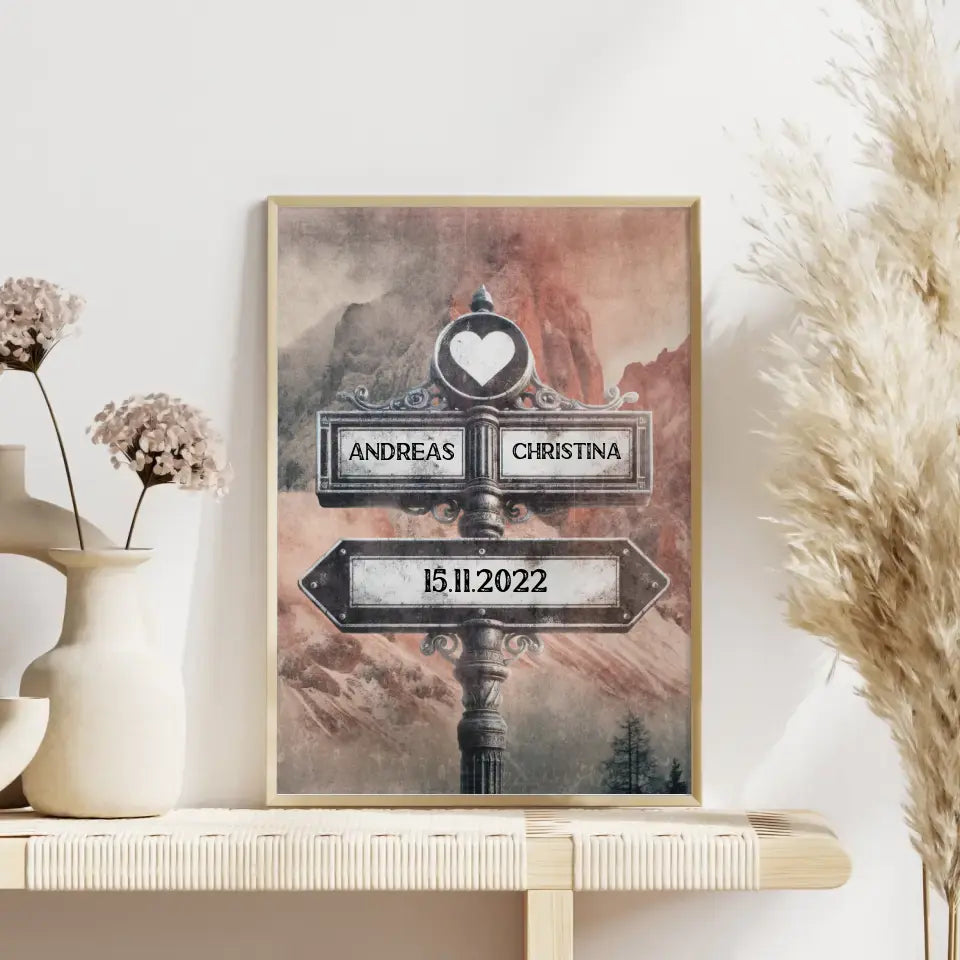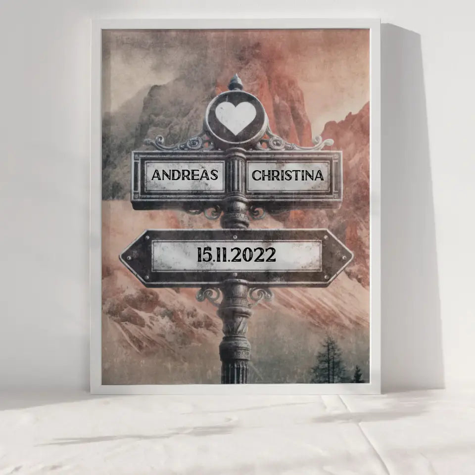Liebes Poster Wegweiser mit Herz Dolomiten Vintage mit Namen & Datum