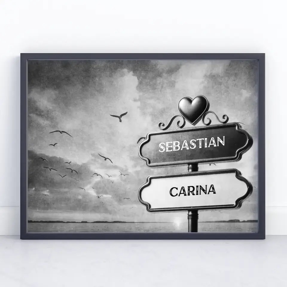 Liebes Poster Wegweiser Schwarz Weiß Strand Sonnenuntergang Vögel mit Namen