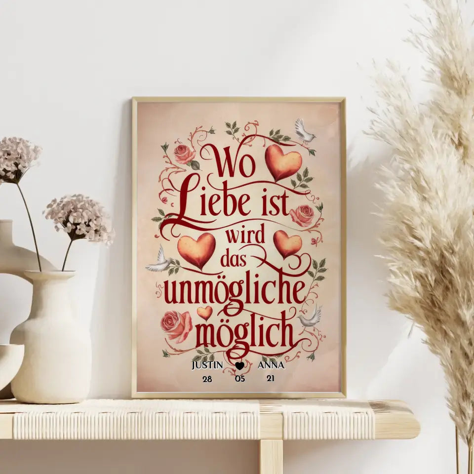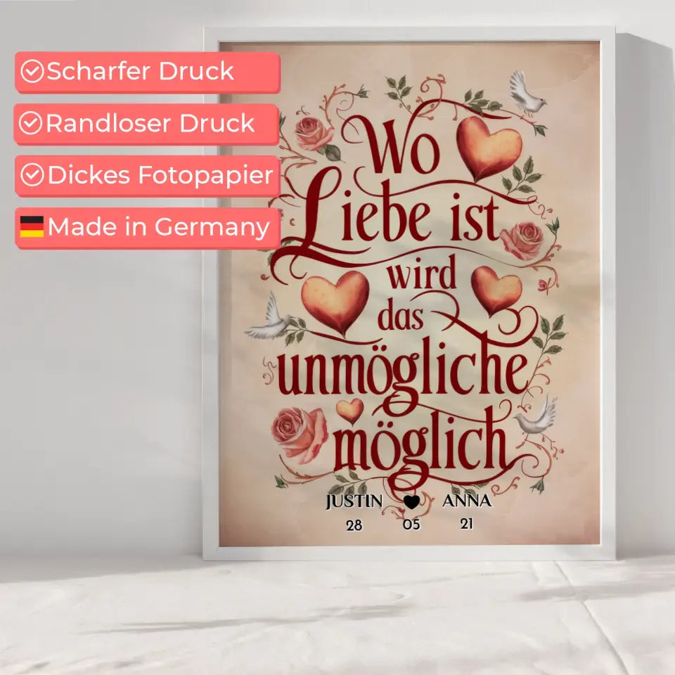 Du suchst ein tolles Geschenk? Dann ist Unser Liebesposter Wo Liebe Ist Wird Das Unmögliche Möglich Personalisiert ein perfektes und super schönes personalisiertes Geschenk.
