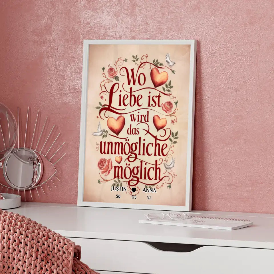 Du suchst ein tolles Geschenk? Dann ist Unser Liebesposter Wo Liebe Ist Wird Das Unmögliche Möglich Personalisiert ein perfektes und super schönes personalisiertes Geschenk.