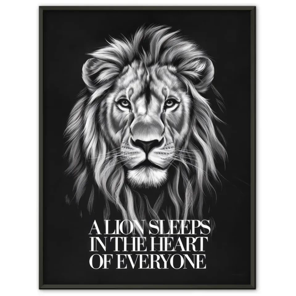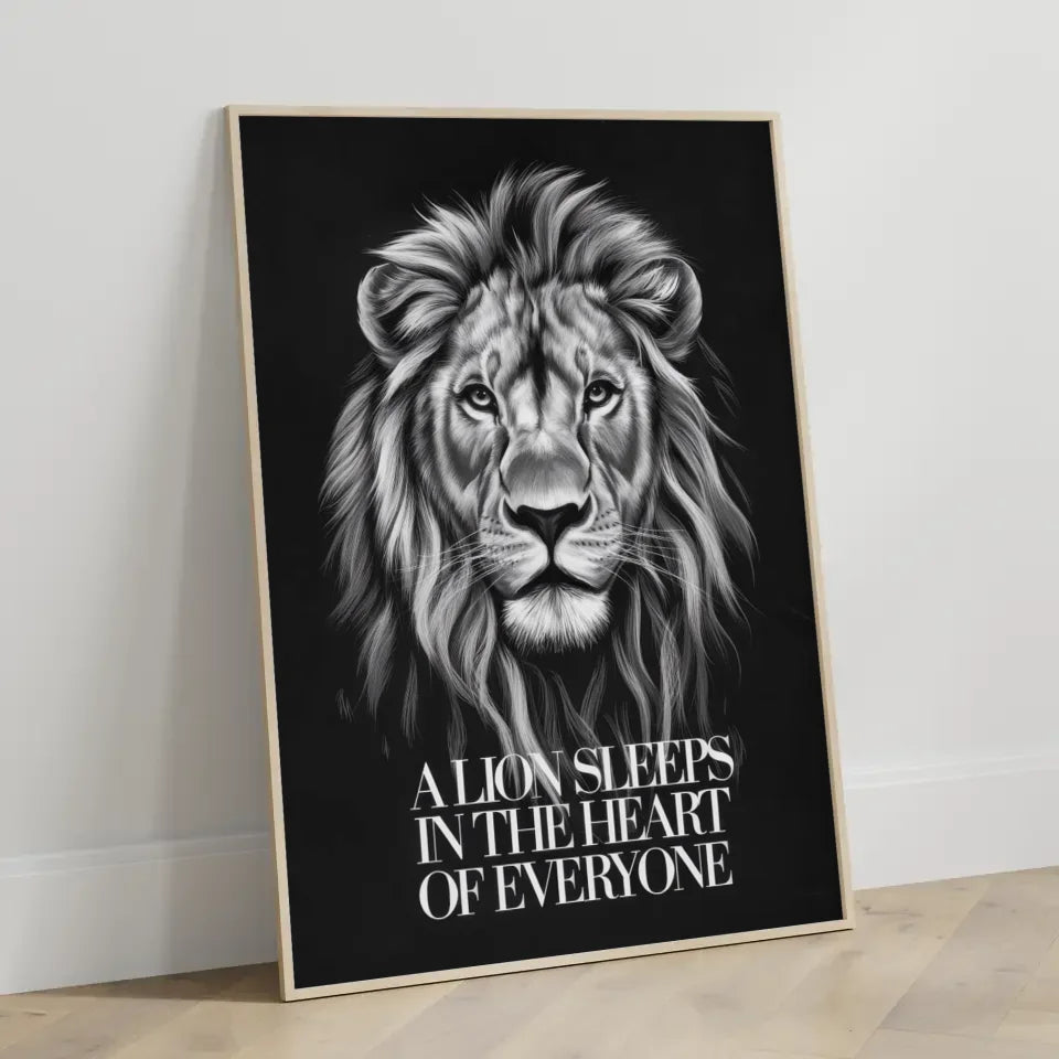 Das Zitat 'Ein Löwe schläft im Herzen eines jeden“ ist in kräftiger, eleganter Typografie unter der Löwenillustration platziert und verstärkt die inspirierende Botschaft des Posters. Dieses Kunstwerk ist nicht nur ein dekorativer Blickfang, sondern auch eine Quelle der Motivation.