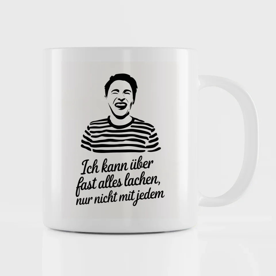 Die minimalistische Illustration einer lachenden Person auf weißem Hintergrund sorgt für einen frischen und modernen Look. Die Person, die ein breites Lächeln trägt und ein gestreiftes Hemd anhat, symbolisiert Lebensfreude und positive Energie. Unterhalb der Illustration finden Sie den humorvollen Spruch 'Ich kann über fast alles lachen, nur nicht mit jedem', der in handgefertigter Schreibschrift gestaltet ist und Ihre Freunde zum Schmunzeln bringt.