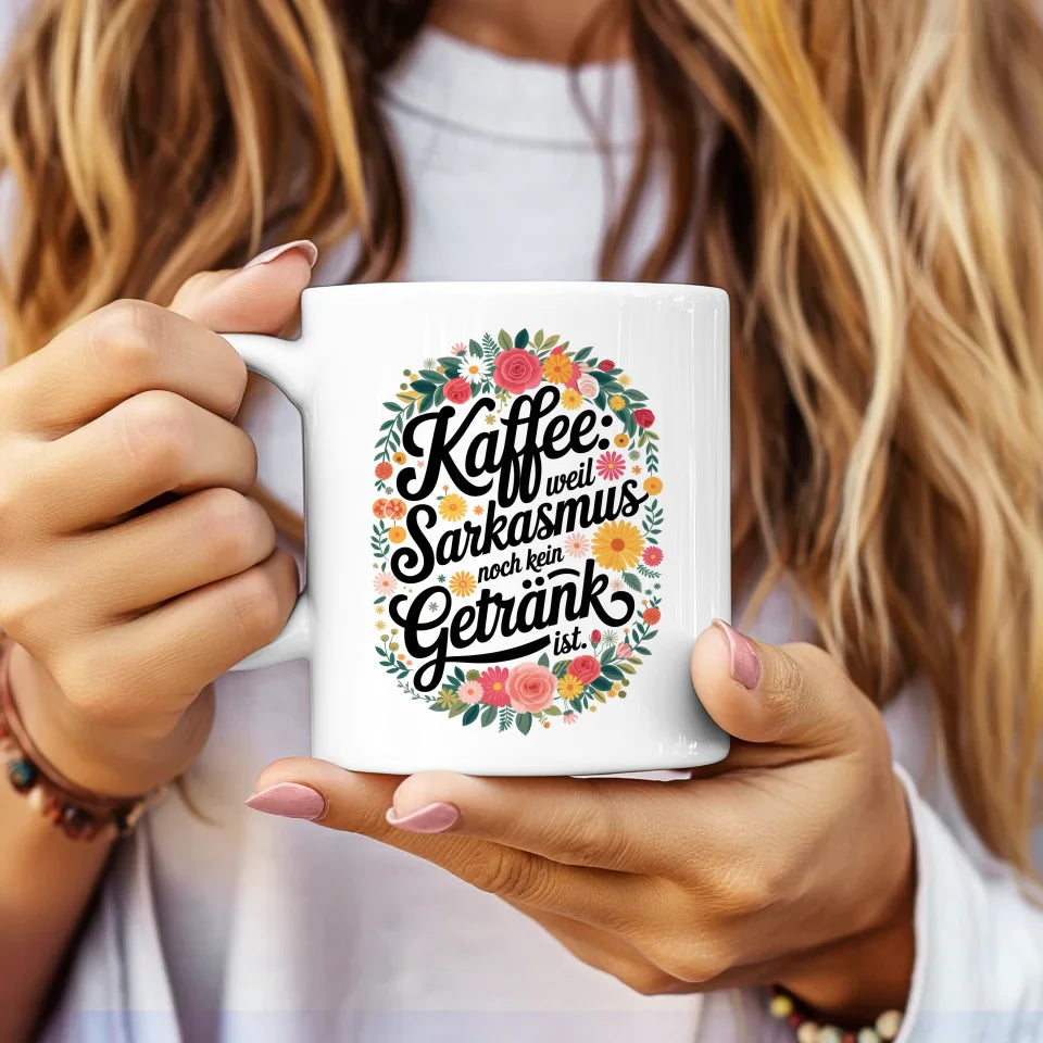 Entdecken Sie unsere einmalige Lustige Sprüche Tasse, die nicht nur Ihre Morgenroutine aufpeppt, sondern auch ein Lächeln auf Ihr Gesicht zaubert. Diese Tasse strahlt mit einem lebendigen Motivationszitat aus: 'Kaffee: Weil Sarkasmus noch kein Getränk ist'. Die fetten, schwarzen Schriftzüge in Kursivschrift bringen den Spruch klar zur Geltung und verleihen ihm eine besondere Note. Umrahmt wird das Zitat von einer atemberaubenden Vielfalt an bunten Blumen und Blättern, darunter elegante Rosen, fröhliche Gänseblümchen und majestätische Lilien. Das durchdachte Blumenmuster schafft eine fröhliche und lebendige Atmosphäre, die Sie jeden Tag aufs Neue motiviert.