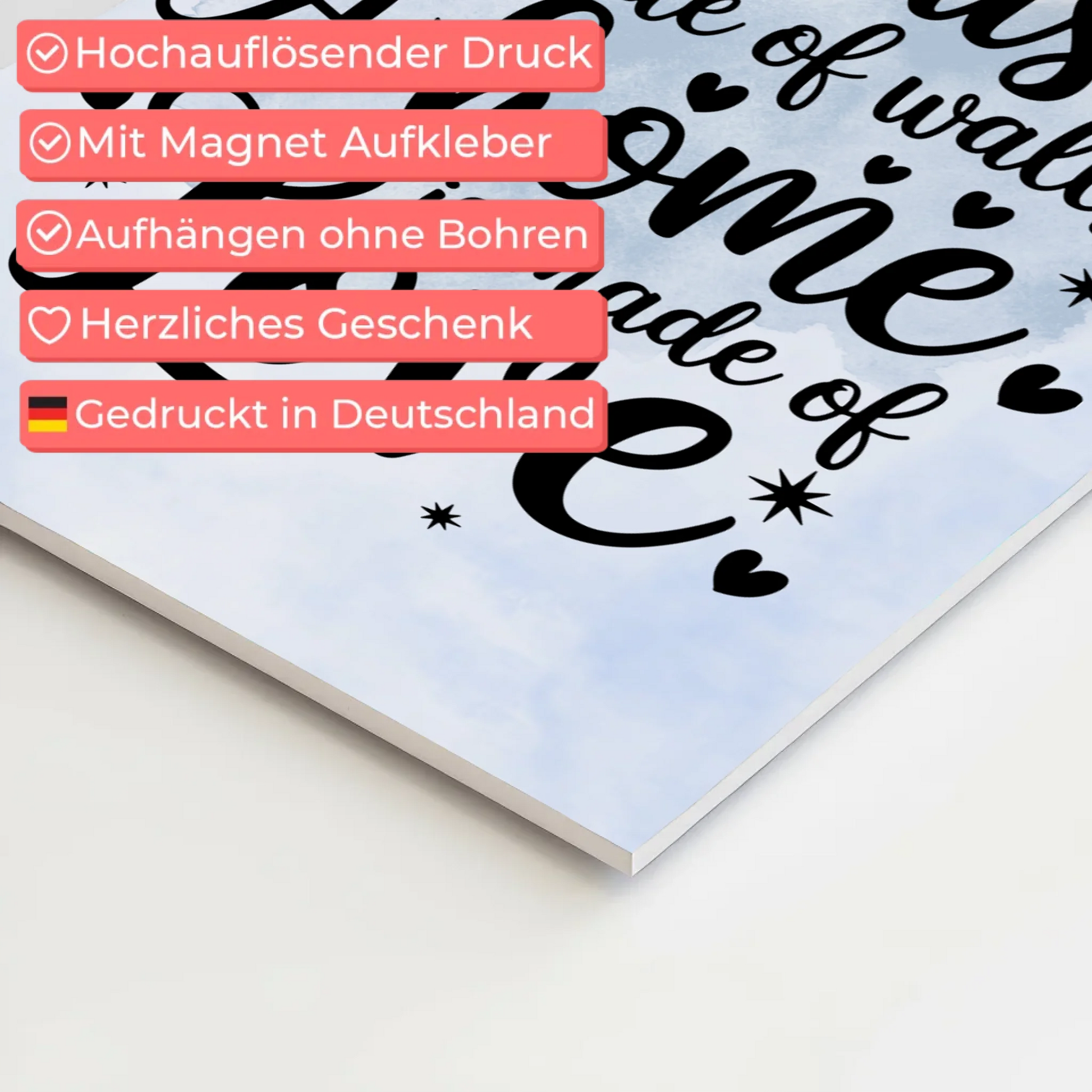 Entdecke das perfekte Geschenk für jeden Anlass: unser personalisierbares Magnet Poster mit Spruch A House is Made of Love. Dieses einzigartige Magnet Poster Fotoboard Mit Spruch ist nicht nur ein dekoratives Highlight, sondern auch eine herzliche Botschaft für jedes Zuhause. Der inspirierende Text 'A house is made of walls, a home is made of love' verleiht jedem Raum eine warme Atmosphäre.
