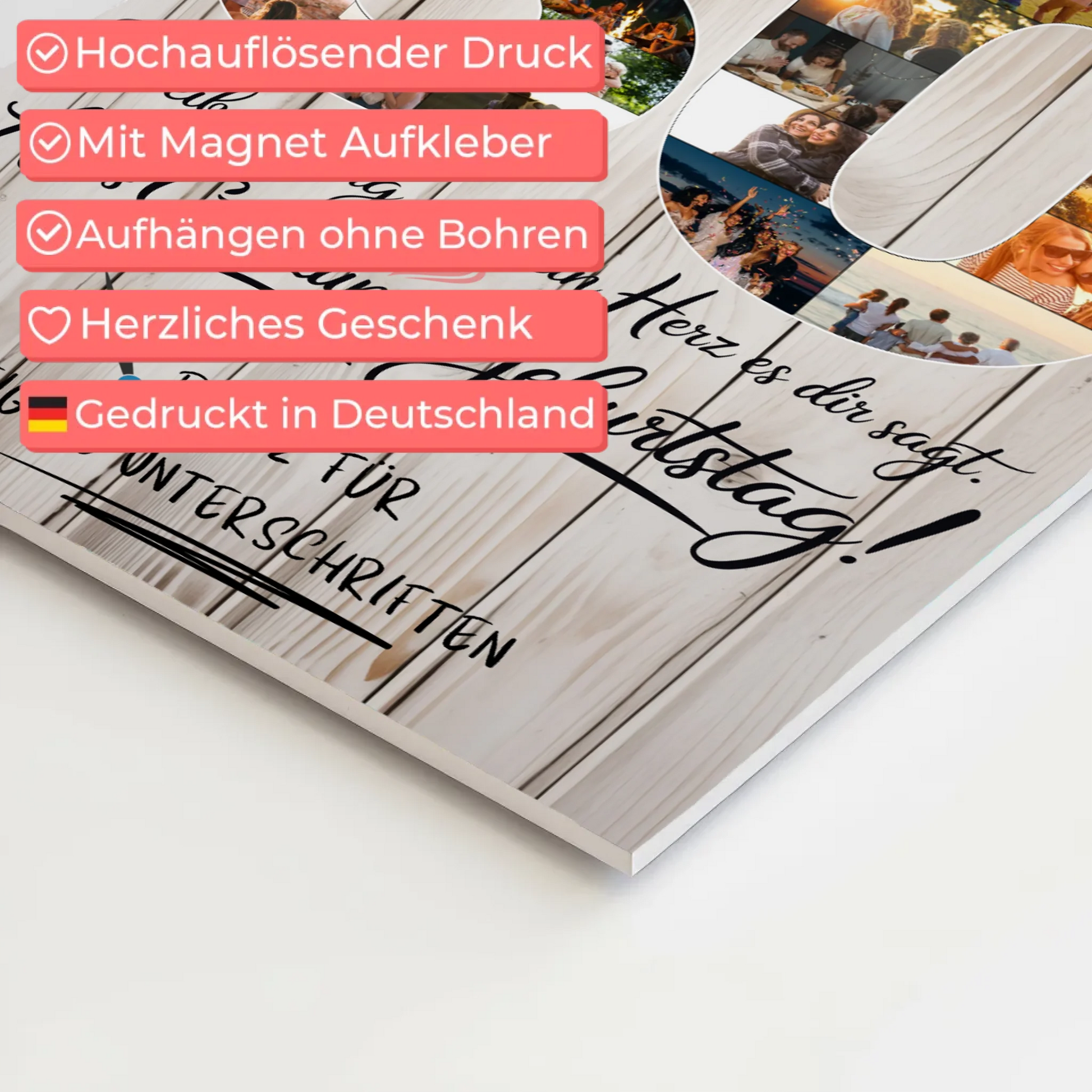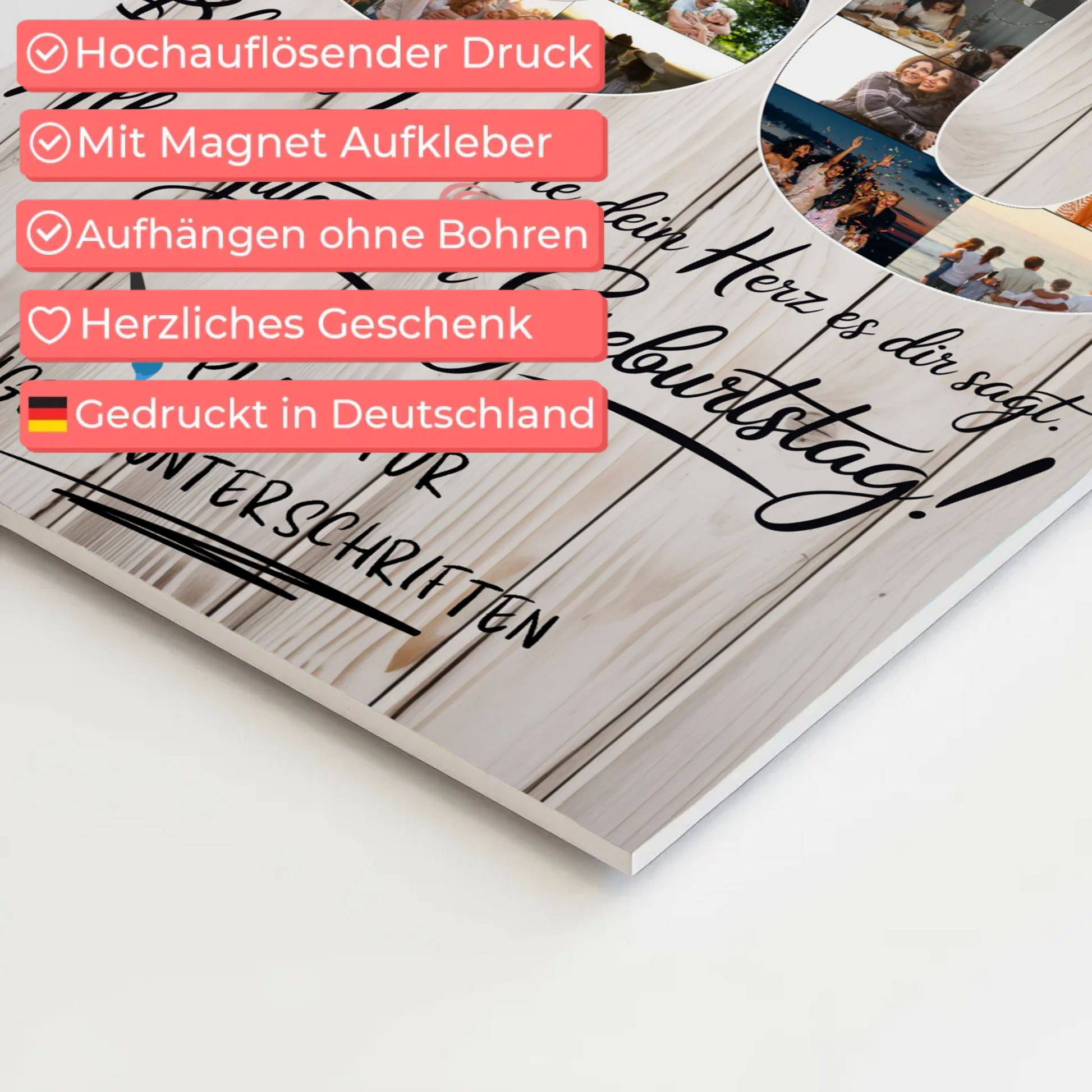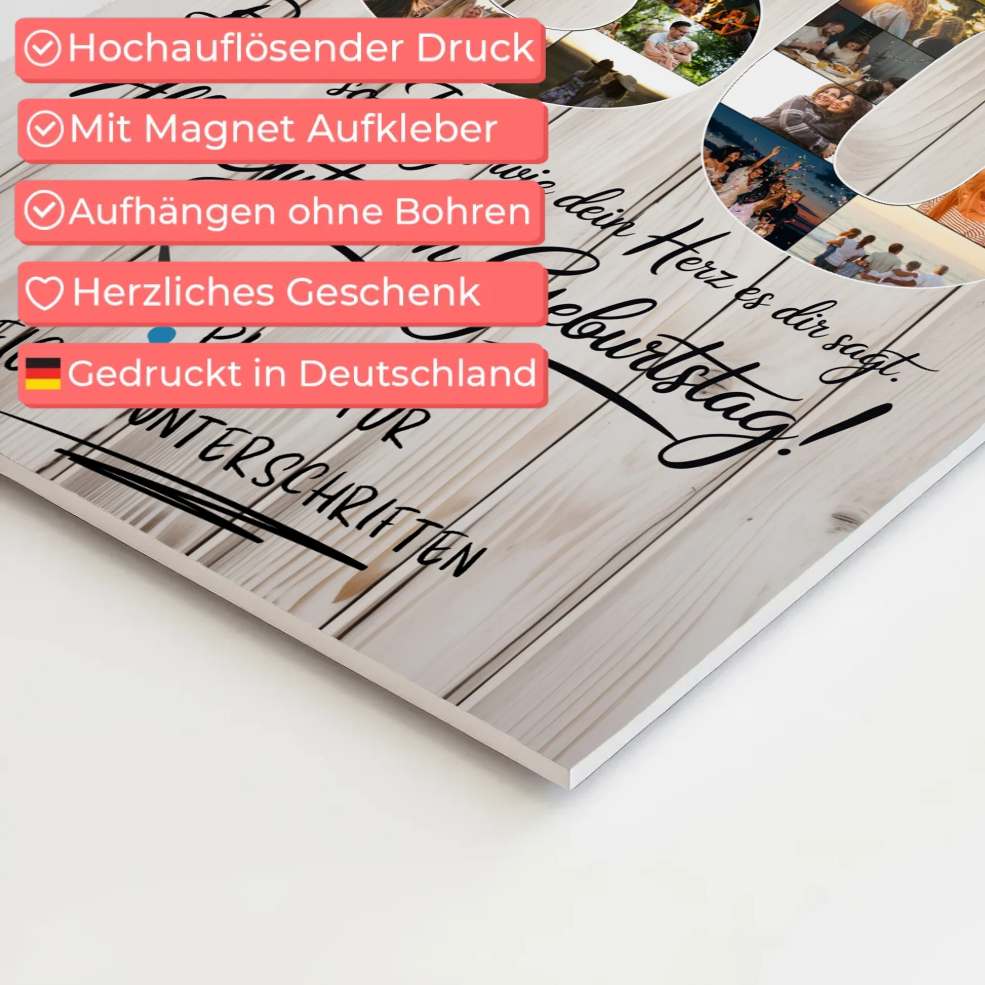 Mit über 20+ Fotos kannst du die schönsten Erinnerungen festhalten und sie perfekt in das Design integrieren. Füge deinen eigenen Spruch oder Wunschtext hinzu, sei es eine liebevolle Botschaft oder ein witziger Text, der zum Schmunzeln anregt. Auch der Name oder sogar deine eigene Unterschrift können im Motiv verewigt werden - alles abgestimmt auf deinen persönlichen Stil!