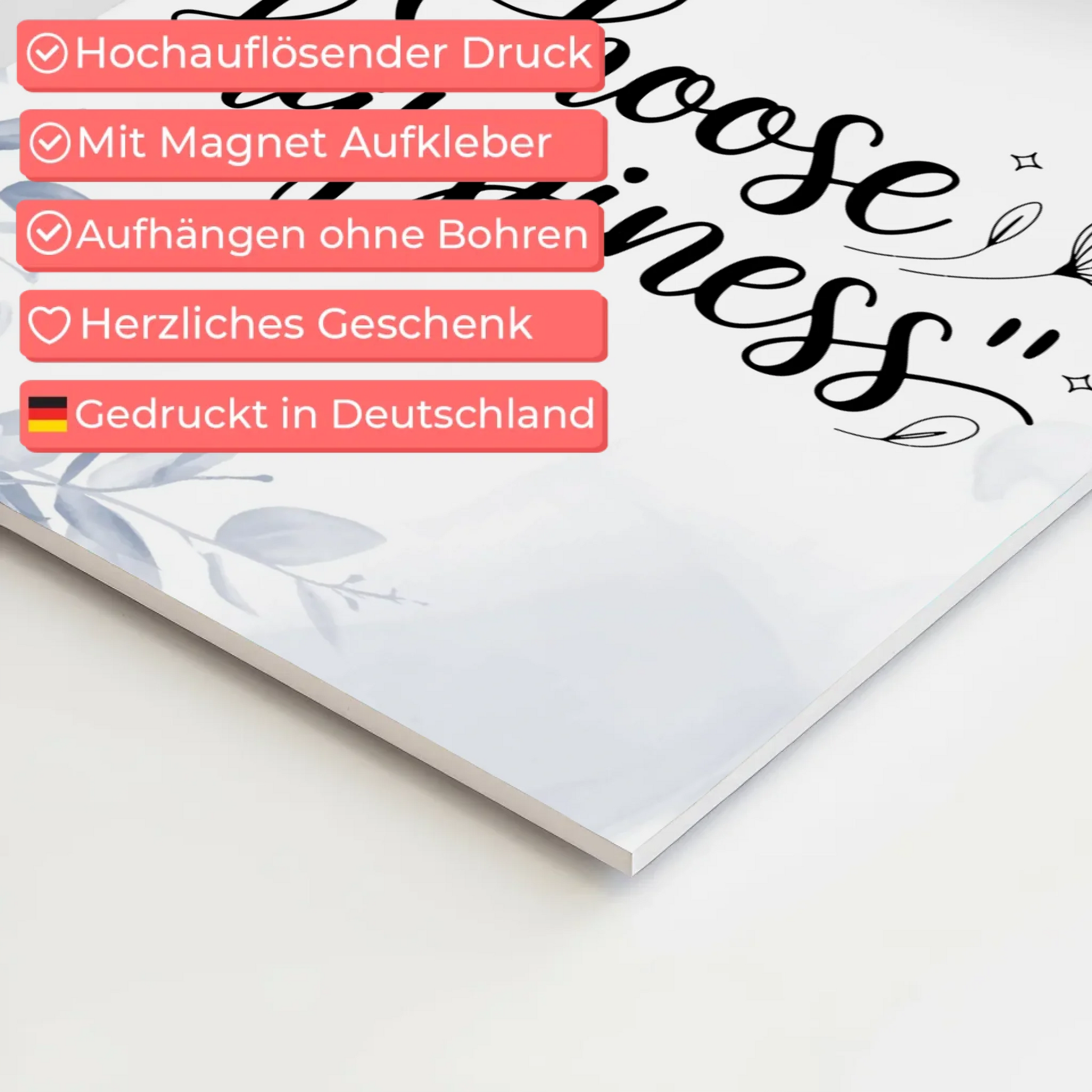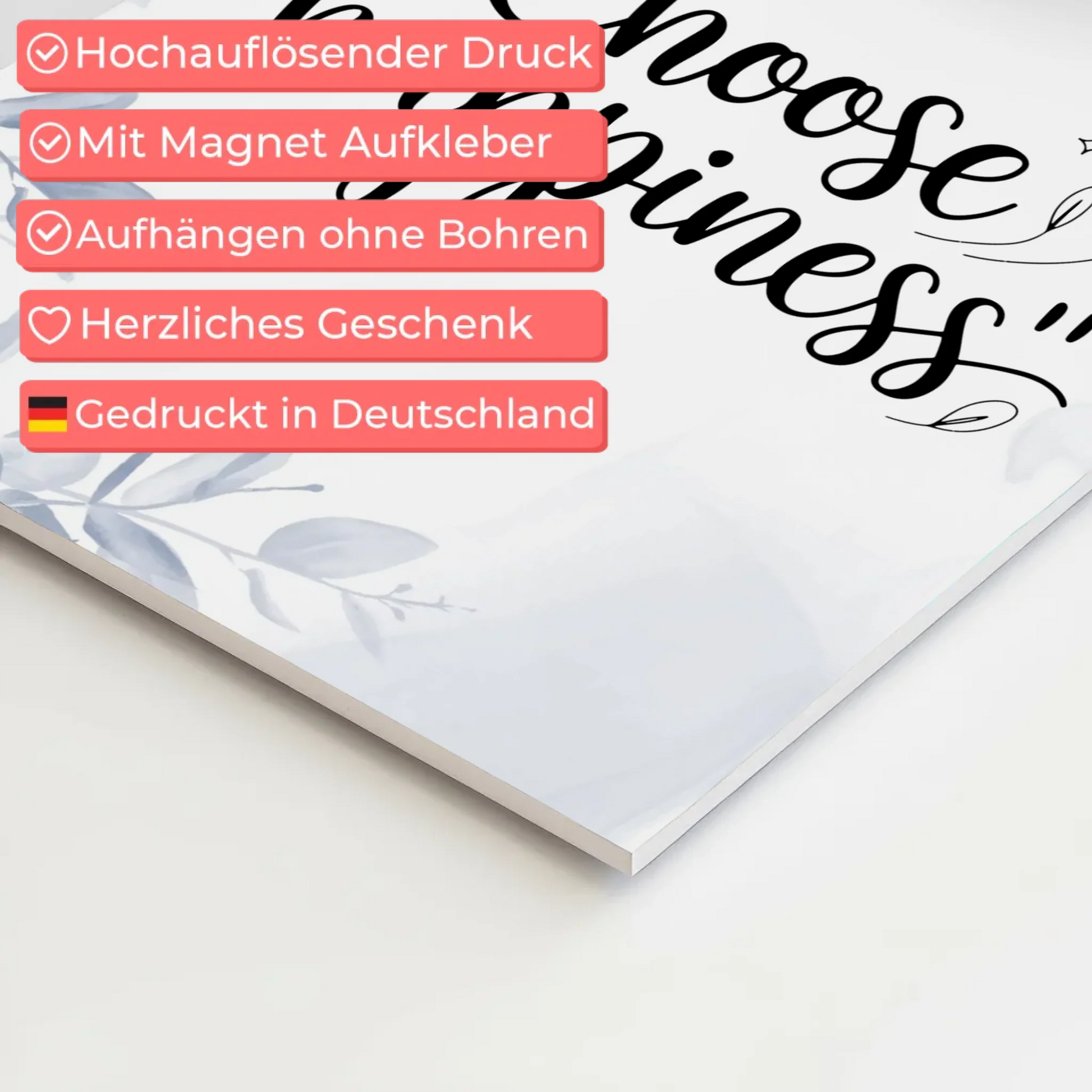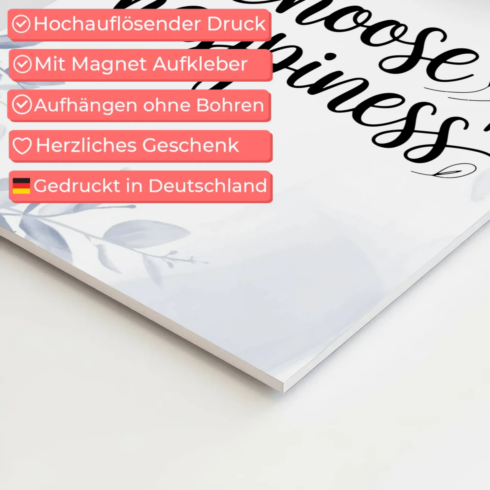 Unsere Motivationssprüche Magnet Poster Fotoboard sind nicht nur dekorativ, sondern auch funktional. Verwende sie als praktisches Memoboard oder einfach als stilvolles Dekoelement in deinem Zuhause. Mit dem Choose Happiness-Spruch setzt du ein positives Statement und bringst gute Laune in jeden Raum.
