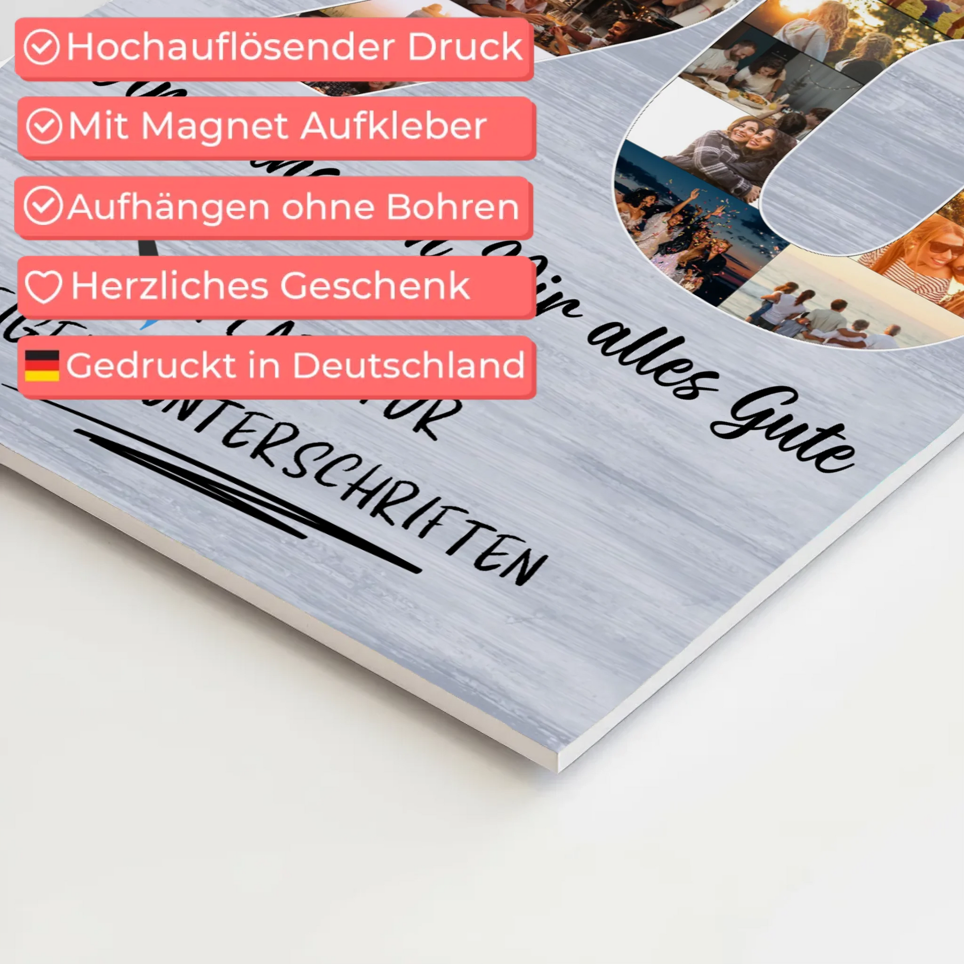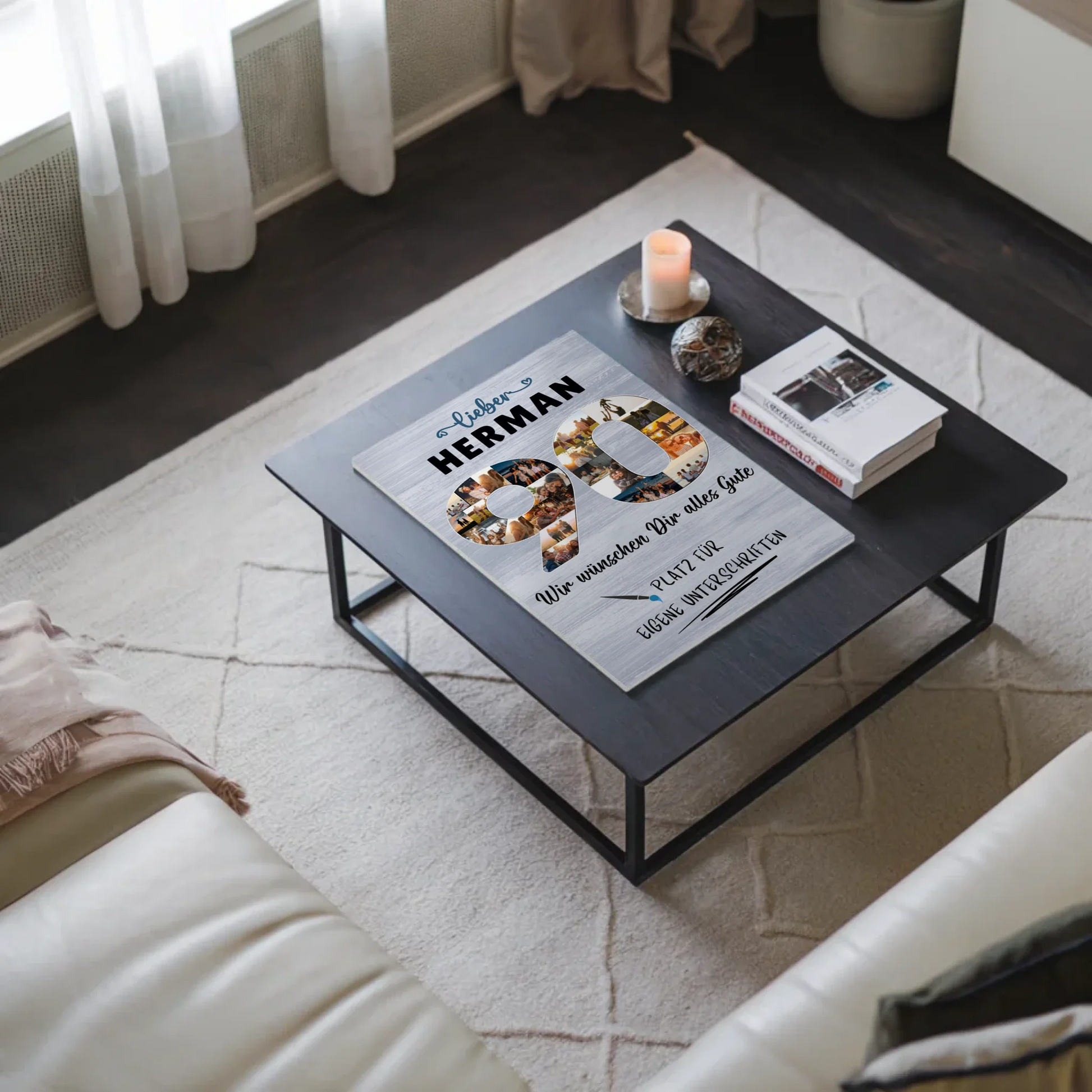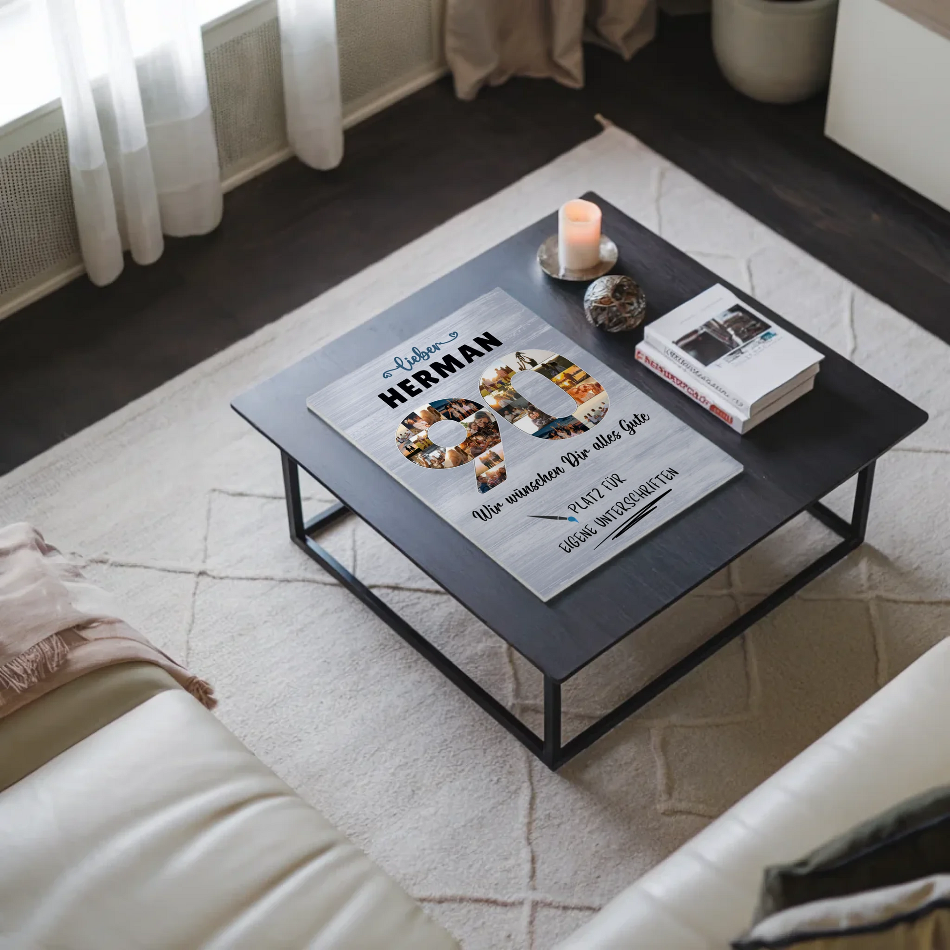 Suchst du nach einem besonderen Geschenk für Opa oder Papa? Mit unserem Magnet Wandbild mit Unterschriften zum 90. Geburtstag schenkst du nicht nur ein einzigartiges Kunstwerk, sondern auch eine wundervolle Erinnerung. Gestalte dein persönliches Wandbild mit über 20+ Fotos, deinem eigenen Spruch oder Wunschtext sowie den Namen und Unterschriften von Freunden und Familie. Das macht es zu einem perfekten Geschenk für Geburtstage und andere besondere Anlässe.