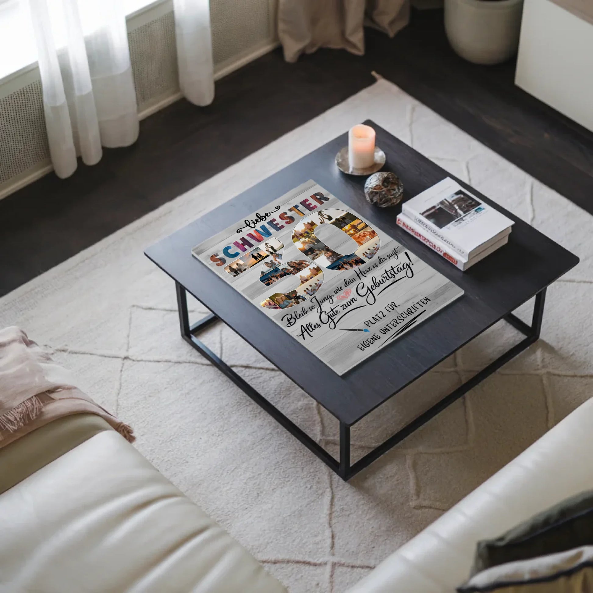 Das Magnet Wandbild eignet sich hervorragend als persönliches Erinnerungsstück für deine Schwester. Mit der Option, Namen oder eigene Unterschriften hinzuzufügen, wird jedes Detail perfekt auf die Beschenkte abgestimmt. Wähle zudem ein schönes Hintergrundbild aus, das den Charakter deiner Schwester widerspiegelt und ihr zeigt: 'Bleib jung!“